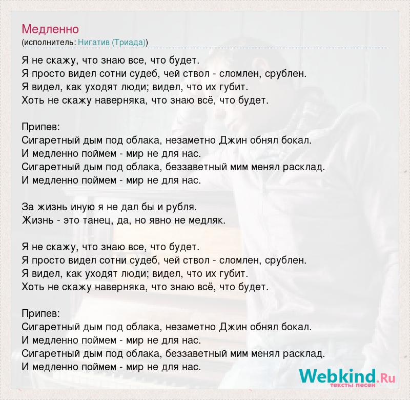Я не скажу, что знаю все, что будет. Я просто видел сотни судеб, чей ствол - сломлен, срублен. Я видел, как уходят люди; видел, что их губит. Хоть не скажу наверняка, что знаю всё, что будет. Припев: Сигаретный дым под облака, незаметно Джин обнял бокал. И медленно поймем - мир не для нас. Сигаретный дым под облака, беззаветный мим менял расклад. И медленно поймем - мир не для нас. За жизнь иную я не дал бы и рубля. Жизнь - это танец, да, но явно не медляк. Я не скажу, что знаю все, что будет. Я просто видел сотни судеб, чей ствол - сломлен, срублен. Я видел, как уходят люди; видел, что их губит. Хоть не скажу наверняка, что знаю всё, что будет. Припев: Сигаретный дым под облака, незаметно Джин обнял бокал. И медленно поймем - мир не для нас. Сигаретный дым под облака, беззаветный мим менял расклад. И медленно поймем - мир не для нас.