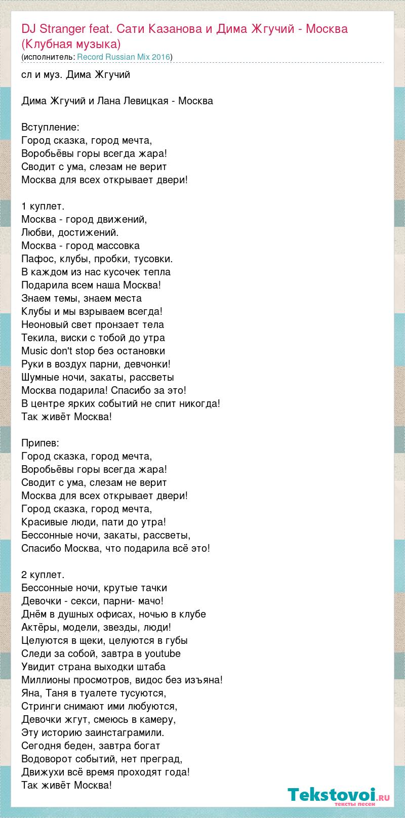 сл и муз. Дима Жгучий Дима Жгучий и Лана Левицкая - Москва Вступление: Город сказка, город мечта, Воробьёвы горы всегда жара! Сводит с ума, слезам не верит Москва для всех открывает двери! 1 куплет. Москва - город движений, Любви, достижений. Москва - город массовка Пафос, клубы, пробки, тусовки. В каждом из нас кусочек тепла Подарила всем наша Москва! Знаем темы, знаем места Клубы и мы взрываем всегда! Неоновый свет пронзает тела Текила, виски с тобой до утра Music don't stop без остановки Руки в воздух парни, девчонки! Шумные ночи, закаты, рассветы Москва подарила! Спасибо за это! В центре ярких событий не спит никогда! Так живёт Москва! Припев: Город сказка, город мечта, Воробьёвы горы всегда жара! Сводит с ума, слезам не верит Москва для всех открывает двери! Город сказка, город мечта, Красивые люди, пати до утра! Бессонные ночи, закаты, рассветы, Спасибо Москва, что подарила всё это! 2 куплет. Бессонные ночи, крутые тачки Девочки - секси, парни- мачо! Днём в душных офисах, ночью в клубе Актёры, модели, звезды, люди! Целуются в щеки, целуются в губы Следи за собой, завтра в youtube Увидит страна выходки штаба Миллионы просмотров, видос без изъяна! Яна, Таня в туалете тусуются, Стринги снимают ими любуются, Девочки жгут, смеюсь в камеру, Эту историю заинстаграмили. Сегодня беден, завтра богат Водоворот событий, нет преград, Движухи всё время проходят года! Так живёт Москва!