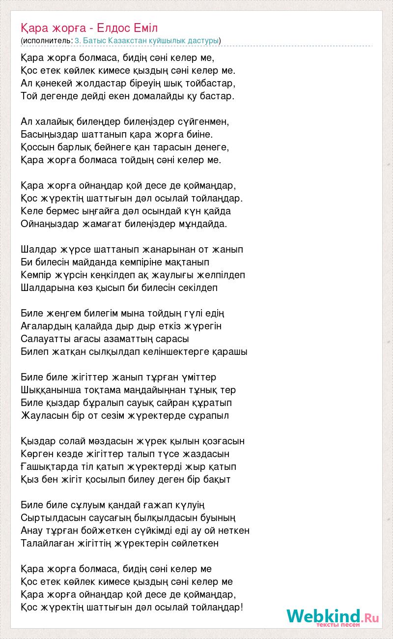 Қара жорға болмаса, бидің сәні келер ме, Қос етек көйлек кимесе қыздың сәні келер ме. Ал қәнекей жолдастар біреуің шық тойбастар, Той дегенде дейді екен домалайды қу бастар. Ал халайық билеңдер билеңіздер сүйгенмен, Басыңыздар шаттанып қара жорға биіне. Қоссын барлық бейнеге қан тарасын денеге, Қара жорға болмаса тойдың сәні келер ме. Қара жорға ойнаңдар қой десе де қоймаңдар, Қос жүректің шаттығын дәл осылай тойлаңдар. Келе бермес ыңғайға дәл осындай күн қайда Ойнаңыздар жамағат билеңіздер мұндайда. Шалдар жүрсе шаттанып жанарынан от жанып Би билесін майданда кемпіріне мақтанып Кемпір жүрсін кеңкілдеп ақ жаулығы желпілдеп Шалдарына көз қысып би билесін секілдеп Биле жеңгем билегім мына тойдың гүлі едің Ағалардың қалайда дыр дыр еткіз жүрегін Салауатты ағасы азаматтың сарасы Билеп жатқан сылқылдап келіншектерге қарашы Биле биле жігіттер жанып тұрған үміттер Шыққанынша тоқтама маңдайыңнан тұнық тер Биле қыздар бұралып сауық сайран құратып Жауласын бір от сезім жүректерде сұрапыл Қыздар солай мәздасын жүрек қылын қозғасын Көрген кезде жігіттер талып түсе жаздасын Ғашықтарда тіл қатып жүректерді жыр қатып Қыз бен жігіт қосылып билеу деген бір бақыт Биле биле сұлуым қандай ғажап күлуің Сыртылдасын саусағың былқылдасын буының Анау тұрған бойжеткен сүйкімді еді ау ой неткен Талайлаған жігіттің жүректерін сөйлеткен Қара жорға болмаса, бидің сәні келер ме Қос етек көйлек кимесе қыздың сәні келер ме Қара жорға ойнаңдар қой десе де қоймаңдар, Қос жүректің шаттығын дәл осылай тойлаңдар!