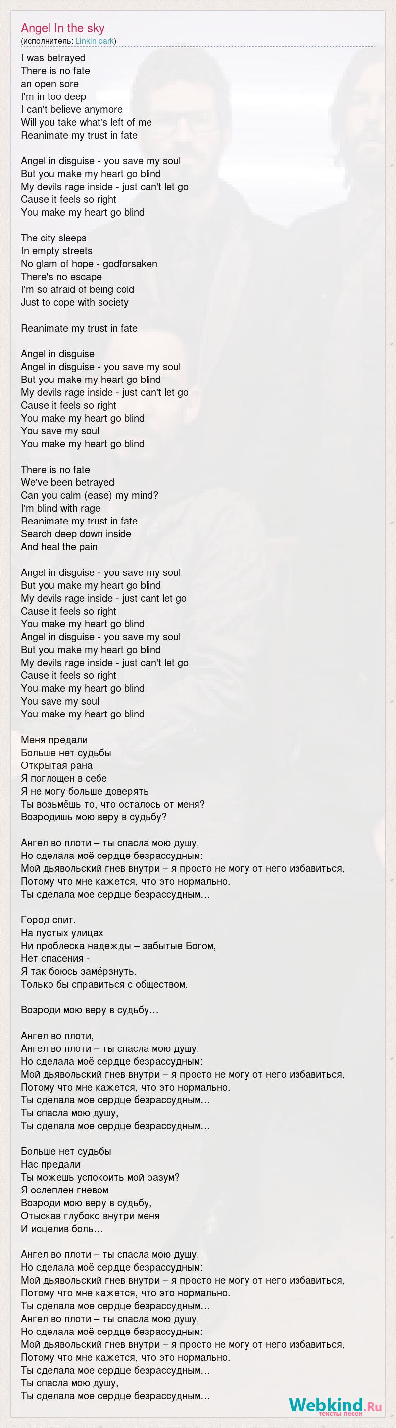 I was betrayed There is no fate an open sore I'm in too deep I can't believe anymore Will you take what's left of me Reanimate my trust in fate Angel in disguise - you save my soul But you make my heart go blind My devils rage inside - just can't let go Cause it feels so right You make my heart go blind The city sleeps In empty streets No glam of hope - godforsaken There's no escape I'm so afraid of being cold Just to cope with society Reanimate my trust in fate Angel in disguise Angel in disguise - you save my soul But you make my heart go blind My devils rage inside - just can't let go Cause it feels so right You make my heart go blind You save my soul You make my heart go blind There is no fate We've been betrayed Can you calm (ease) my mind? I'm blind with rage Reanimate my trust in fate Search deep down inside And heal the pain Angel in disguise - you save my soul But you make my heart go blind My devils rage inside - just cant let go Cause it feels so right You make my heart go blind Angel in disguise - you save my soul But you make my heart go blind My devils rage inside - just can't let go Cause it feels so right You make my heart go blind You save my soul You make my heart go blind ________________________________ Меня предали Больше нет судьбы Открытая рана Я поглощен в себе Я не могу больше доверять Ты возьмёшь то, что осталось от меня? Возродишь мою веру в судьбу? Ангел во плоти – ты спасла мою душу, Но сделала моё сердце безрассудным: Мой дьявольский гнев внутри – я просто не могу от него избавиться, Потому что мне кажется, что это нормально. Ты сделала мое сердце безрассудным… Город спит. На пустых улицах Ни проблеска надежды – забытые Богом, Нет спасения - Я так боюсь замёрзнуть. Только бы справиться с обществом. Возроди мою веру в судьбу… Ангел во плоти, Ангел во плоти – ты спасла мою душу, Но сделала моё сердце безрассудным: Мой дьявольский гнев внутри – я просто не могу от него избавиться, Потому что мне кажется, что это нормально. Ты сделала мое сердце безрассудным… Ты спасла мою душу, Ты сделала мое сердце безрассудным… Больше нет судьбы Нас предали Ты можешь успокоить мой разум? Я ослеплен гневом Возроди мою веру в судьбу, Отыскав глубоко внутри меня И исцелив боль… Ангел во плоти – ты спасла мою душу, Но сделала моё сердце безрассудным: Мой дьявольский гнев внутри – я просто не могу от него избавиться, Потому что мне кажется, что это нормально. Ты сделала мое сердце безрассудным… Ангел во плоти – ты спасла мою душу, Но сделала моё сердце безрассудным: Мой дьявольский гнев внутри – я просто не могу от него избавиться, Потому что мне кажется, что это нормально. Ты сделала мое сердце безрассудным… Ты спасла мою душу, Ты сделала мое сердце безрассудным…