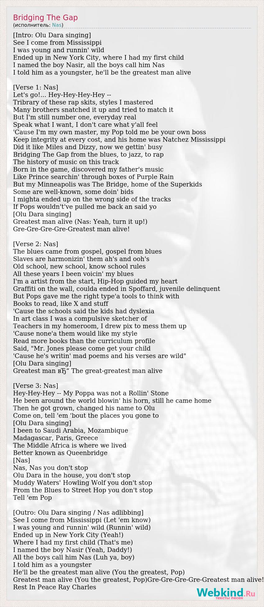 [Intro: Olu Dara singing] See I come from Mississippi I was young and runnin' wild Ended up in New York City, where I had my first child I named the boy Nasir, all the boys call him Nas I told him as a youngster, he'll be the greatest man alive [Verse 1: Nas] Let's go!... Hey-Hey-Hey-Hey -- Tribrary of these rap skits, styles I mastered Many brothers snatched it up and tried to match it But I'm still number one, everyday real Speak what I want, I don't care what y'all feel 'Cause I'm my own master, my Pop told me be your own boss Keep integrity at every cost, and his home was Natchez Mississippi Did it like Miles and Dizzy, now we gettin' busy Bridging The Gap from the blues, to jazz, to rap The history of music on this track Born in the game, discovered my father's music Like Prince searchin' through boxes of Purple Rain But my Minneapolis was The Bridge, home of the Superkids Some are well-known, some doin' bids I mighta ended up on the wrong side of the tracks If Pops wouldn't've pulled me back an said yo [Olu Dara singing] Greatest man alive (Nas: Yeah, turn it up!) Gre-Gre-Gre-Gre-Greatest man alive! [Verse 2: Nas] The blues came from gospel, gospel from blues Slaves are harmonizin' them ah's and ooh's Old school, new school, know school rules All these years I been voicin' my blues I'm a artist from the start, Hip-Hop guided my heart Graffiti on the wall, coulda ended in Spoffard, juvenile delinquent But Pops gave me the right type'a tools to think with Books to read, like X and stuff 'Cause the schools said the kids had dyslexia In art class I was a compulsive sketcher of Teachers in my homeroom, I drew pix to mess them up 'Cause none'a them would like my style Read more books than the curriculum profile Said, "Mr. Jones please come get your child 'Cause he's writin' mad poems and his verses are wild" [Olu Dara singing] Greatest man – The great-greatest man alive [Verse 3: Nas] Hey-Hey-Hey -- My Poppa was not a Rollin' Stone He been around the world blowin' his horn, still he came home Then he got grown, changed his name to Olu Come on, tell 'em 'bout the places you gone to [Olu Dara singing] I been to Saudi Arabia, Mozambique Madagascar, Paris, Greece The Middle Africa is where we lived Better known as Queenbridge [Nas] Nas, Nas you don't stop Olu Dara in the house, you don't stop Muddy Waters' Howling Wolf you don't stop From the Blues to Street Hop you don't stop Tell 'em Pop [Outro: Olu Dara singing / Nas adlibbing] See I come from Mississippi (Let 'em know) I was young and runnin' wild (Runnin' wild) Ended up in New York City (Yeah!) Where I had my first child (That's me) I named the boy Nasir (Yeah, Daddy!) All the boys call him Nas (Luh ya, boy) I told him as a youngster He'll be the greatest man alive (You the greatest, Pop) Greatest man alive (You the greatest, Pop)Gre-Gre-Gre-Gre-Greatest man alive! Rest In Peace Ray Charles