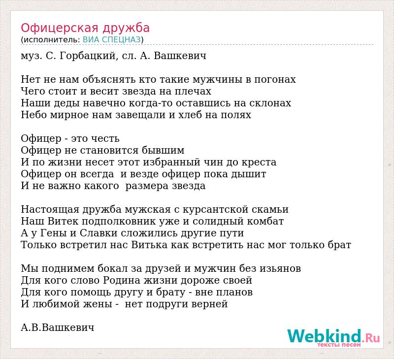муз. С. Горбацкий, сл. А. Вашкевич Нет не нам объяснять кто такие мужчины в погонах Чего стоит и весит звезда на плечах Наши деды навечно когда-то оставшись на склонах Небо мирное нам завещали и хлеб на полях Офицер - это честь Офицер не становится бывшим И по жизни несет этот избранный чин до креста Офицер он всегда и везде офицер пока дышит И не важно какого размера звезда Настоящая дружба мужская с курсантской скамьи Наш Витек подполковник уже и солидный комбат А у Гены и Славки сложились другие пути Только встретил нас Витька как встретить нас мог только брат Мы поднимем бокал за друзей и мужчин без изьянов Для кого слово Родина жизни дороже своей Для кого помощь другу и брату - вне планов И любимой жены - нет подруги верней А.В.Вашкевич