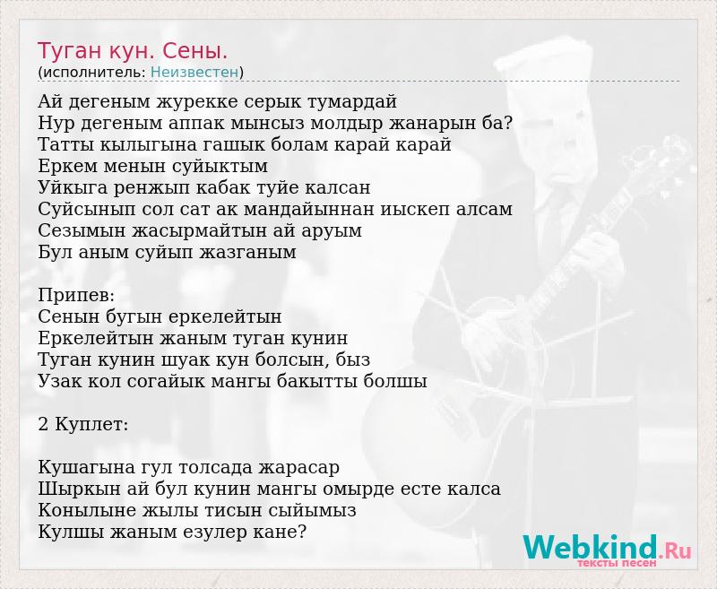Ай дегеным журекке серык тумардай Нур дегеным аппак мынсыз молдыр жанарын ба? Татты кылыгына гашык болам карай карай Еркем менын суйыктым Уйкыга ренжып кабак туйе калсан Суйсынып сол сат ак мандайыннан иыскеп алсам Сезымын жасырмайтын ай аруым Бул аным суйып жазганым Припев: Сенын бугын еркелейтын Еркелейтын жаным туган кунин Туган кунин шуак кун болсын, быз Узак кол согайык мангы бакытты болшы 2 Куплет: Кушагына гул толсада жарасар Шыркын ай бул кунин мангы омырде есте калса Конылыне жылы тисын сыйымыз Кулшы жаным езулер кане?