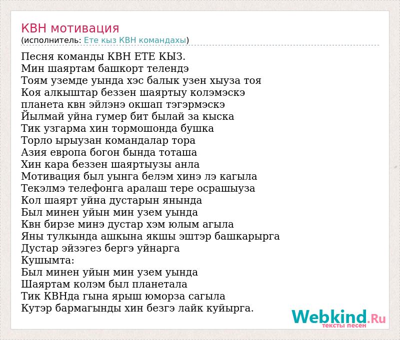 Песня команды КВН ЕТЕ КЫЗ. Мин шаяртам башкорт телендэ Тоям уземде уында хэс балык узен хыуза тоя Коя алкыштар беззен шаяртыу колэмэскэ планета квн эйлэнэ окшап тэгэрмэскэ Йылмай уйна гумер бит былай за кыска Тик узгарма хин тормошонда бушка Торло ырыузан командалар тора Азия европа богон бында тоташа Хин кара беззен шаяртыузы анла Мотивация был уынга белэм хинэ лэ кагыла Текэлмэ телефонга аралаш тере осрашыуза Кол шаярт уйна дустарын янында Был минен уйын мин узем уында Квн бирзе минэ дустар хэм юлым агыла Яны тулкында ашкына якшы эштэр башкарырга Дустар эйзэгез бергэ уйнарга Кушымта: Был минен уйын мин узем уында Шаяртам колэм был планетала Тик КВНда гына ярыш юморза сагыла Кутэр бармагынды хин безгэ лайк куйырга.