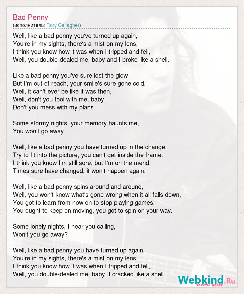 Well, like a bad penny you've turned up again, You're in my sights, there's a mist on my lens. I think you know how it was when I tripped and fell, Well, you double-dealed me, baby and I broke like a shell. Like a bad penny you've sure lost the glow But I'm out of reach, your smile's sure gone cold. Well, it can't ever be like it was then, Well, don't you fool with me, baby, Don't you mess with my plans. Some stormy nights, your memory haunts me, You won't go away. Well, like a bad penny you have turned up in the change, Try to fit into the picture, you can't get inside the frame. I think you know I'm still sore, but I'm on the mend, Times sure have changed, it won't happen again. Well, like a bad penny spins around and around, Well, you won't know what's gone wrong when it all falls down, You got to learn from now on to stop playing games, You ought to keep on moving, you got to spin on your way. Some lonely nights, I hear you calling, Won't you go away? Well, like a bad penny you have turned up again, You're in my sights, there's a mist on my lens. I think you know how it was when I tripped and fell, Well, you double-dealed me, baby, I cracked like a shell.