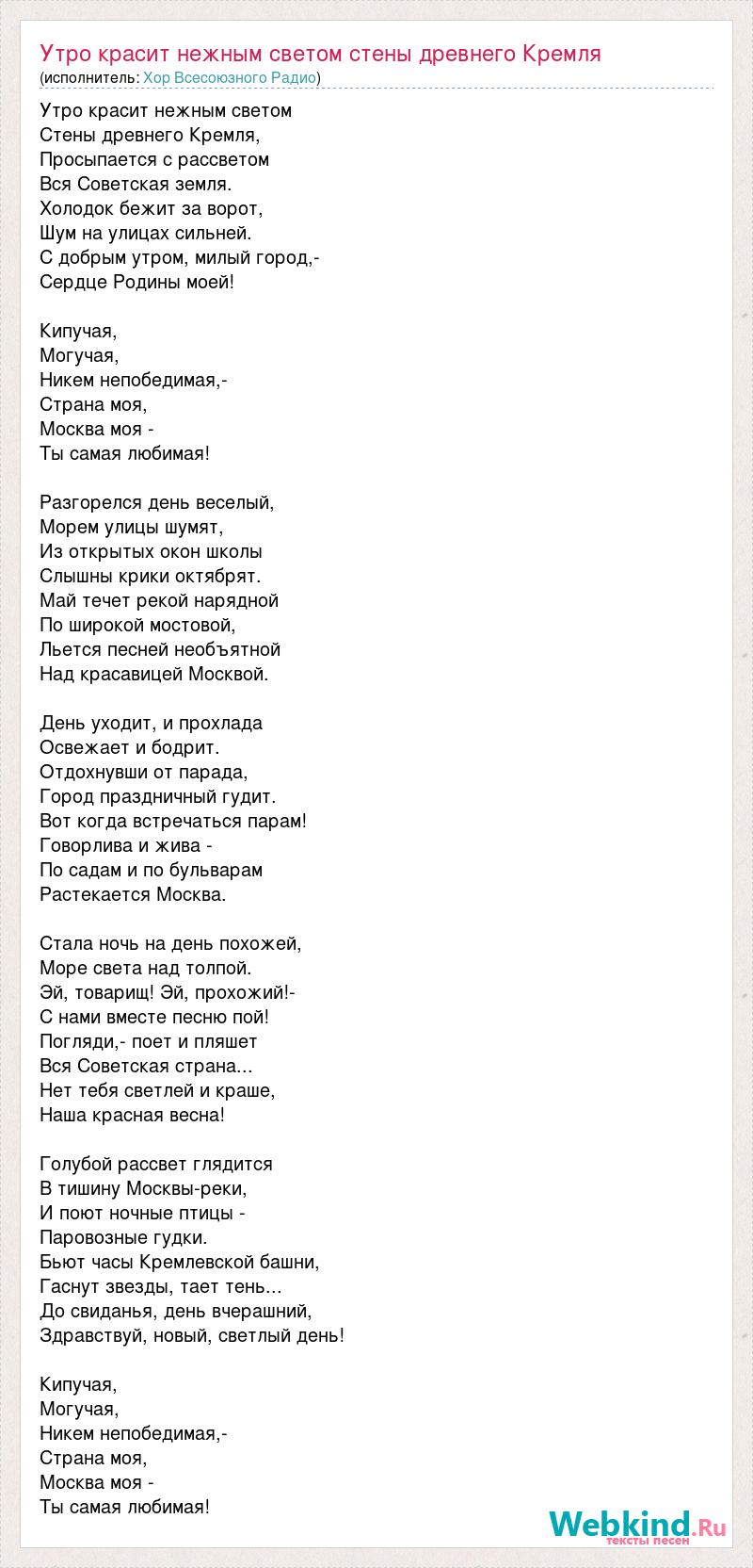 Утро красит нежным светом Стены древнего Кремля, Просыпается с рассветом Вся Советская земля. Холодок бежит за ворот, Шум на улицах сильней. С добрым утром, милый город,- Сердце Родины моей! Кипучая, Могучая, Никем непобедимая,- Страна моя, Москва моя - Ты самая любимая! Разгорелся день веселый, Морем улицы шумят, Из открытых окон школы Слышны крики октябрят. Май течет рекой нарядной По широкой мостовой, Льется песней необъятной Над красавицей Москвой. День уходит, и прохлада Освежает и бодрит. Отдохнувши от парада, Город праздничный гудит. Вот когда встречаться парам! Говорлива и жива - По садам и по бульварам Растекается Москва. Стала ночь на день похожей, Море света над толпой. Эй, товарищ! Эй, прохожий!- С нами вместе песню пой! Погляди,- поет и пляшет Вся Советская страна... Нет тебя светлей и краше, Наша красная весна! Голубой рассвет глядится В тишину Москвы-реки, И поют ночные птицы - Паровозные гудки. Бьют часы Кремлевской башни, Гаснут звезды, тает тень... До свиданья, день вчерашний, Здравствуй, новый, светлый день! Кипучая, Могучая, Никем непобедимая,- Страна моя, Москва моя - Ты самая любимая!