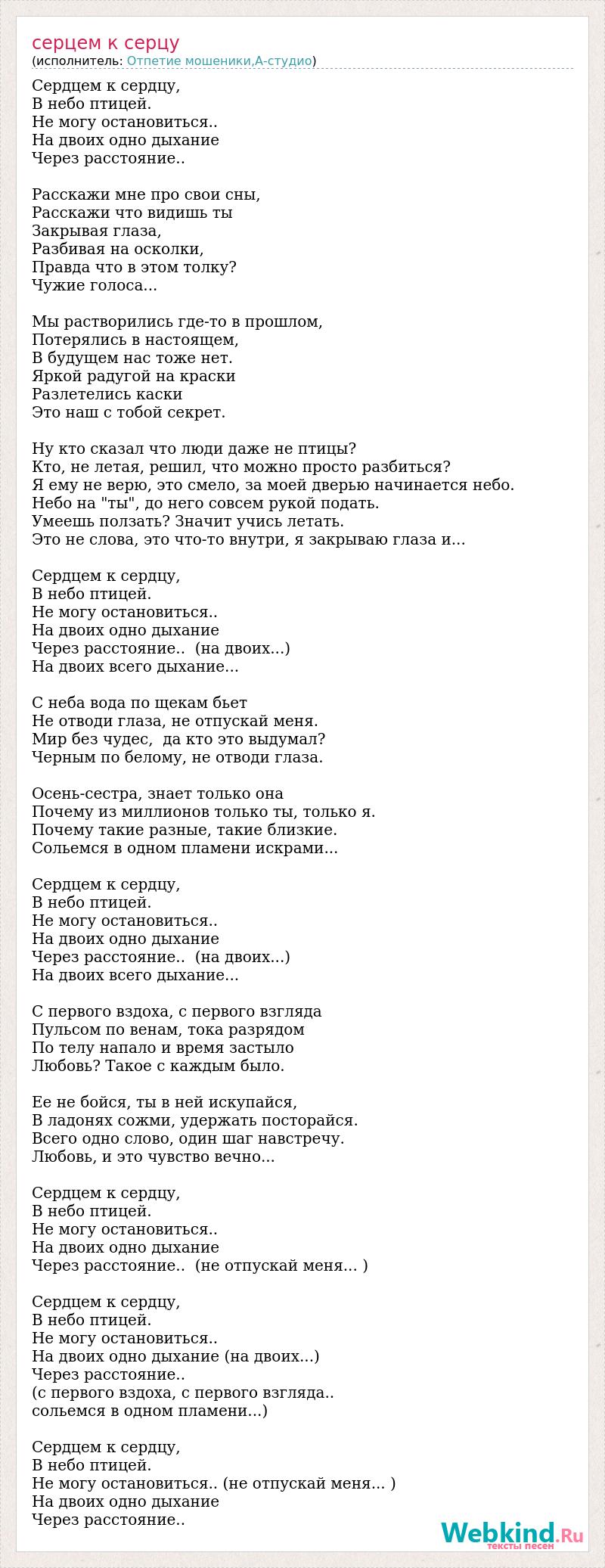 Сердцем к сердцу, В небо птицей. Не могу остановиться.. На двоих одно дыхание Через расстояние.. Расскажи мне про свои сны, Расскажи что видишь ты Закрывая глаза, Разбивая на осколки, Правда что в этом толку? Чужие голоса... Мы растворились где-то в прошлом, Потерялись в настоящем, В будущем нас тоже нет. Яркой радугой на краски Разлетелись каски Это наш с тобой секрет. Ну кто сказал что люди даже не птицы? Кто, не летая, решил, что можно просто разбиться? Я ему не верю, это смело, за моей дверью начинается небо. Небо на "ты", до него совсем рукой подать. Умеешь ползать? Значит учись летать. Это не слова, это что-то внутри, я закрываю глаза и... Сердцем к сердцу, В небо птицей. Не могу остановиться.. На двоих одно дыхание Через расстояние.. (на двоих...) На двоих всего дыхание... С неба вода по щекам бьет Не отводи глаза, не отпускай меня. Мир без чудес, да кто это выдумал? Черным по белому, не отводи глаза. Осень-сестра, знает только она Почему из миллионов только ты, только я. Почему такие разные, такие близкие. Сольемся в одном пламени искрами... Сердцем к сердцу, В небо птицей. Не могу остановиться.. На двоих одно дыхание Через расстояние.. (на двоих...) На двоих всего дыхание... С первого вздоха, с первого взгляда Пульсом по венам, тока разрядом По телу напало и время застыло Любовь? Такое с каждым было. Ее не бойся, ты в ней искупайся, В ладонях сожми, удержать посторайся. Всего одно слово, один шаг навстречу. Любовь, и это чувство вечно... Сердцем к сердцу, В небо птицей. Не могу остановиться.. На двоих одно дыхание Через расстояние.. (не отпускай меня... ) Сердцем к сердцу, В небо птицей. Не могу остановиться.. На двоих одно дыхание (на двоих...) Через расстояние.. (с первого вздоха, с первого взгляда.. сольемся в одном пламени...) Сердцем к сердцу, В небо птицей. Не могу остановиться.. (не отпускай меня... ) На двоих одно дыхание Через расстояние..