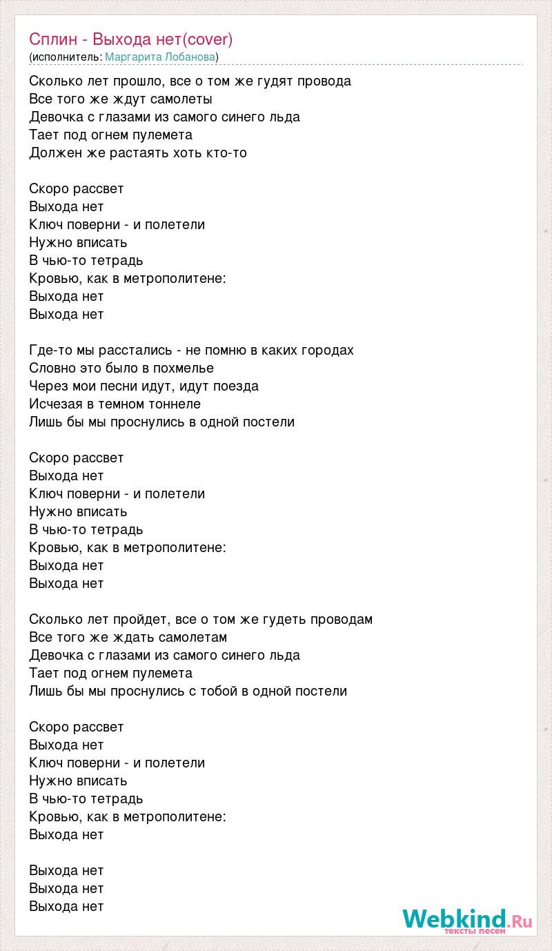 Сколько лет прошло, все о том же гудят провода Все того же ждут самолеты Девочка с глазами из самого синего льда Тает под огнем пулемета Должен же растаять хоть кто-то Скоро рассвет Выхода нет Ключ поверни - и полетели Нужно вписать В чью-то тетрадь Кровью, как в метрополитене: Выхода нет Выхода нет Где-то мы расстались - не помню в каких городах Словно это было в похмелье Через мои песни идут, идут поезда Исчезая в темном тоннеле Лишь бы мы проснулись в одной постели Скоро рассвет Выхода нет Ключ поверни - и полетели Нужно вписать В чью-то тетрадь Кровью, как в метрополитене: Выхода нет Выхода нет Сколько лет пройдет, все о том же гудеть проводам Все того же ждать самолетам Девочка с глазами из самого синего льда Тает под огнем пулемета Лишь бы мы проснулись с тобой в одной постели Скоро рассвет Выхода нет Ключ поверни - и полетели Нужно вписать В чью-то тетрадь Кровью, как в метрополитене: Выхода нет Выхода нет Выхода нет Выхода нет