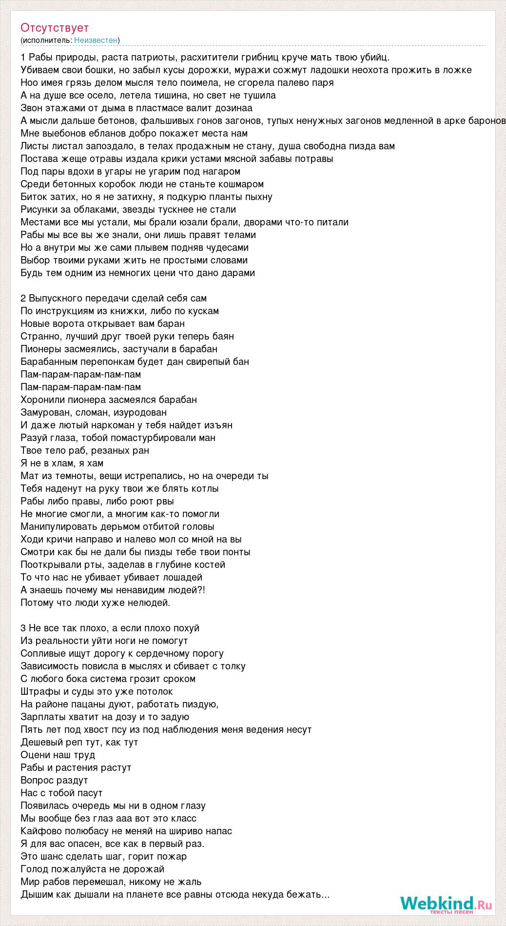 1 Рабы природы, раста патриоты, расхитители грибниц круче мать твою убийц. Убиваем свои бошки, но забыл кусы дорожки, муражи сожмут ладошки неохота прожить в ложке Ноо имея грязь делом мысля тело поимела, не сгорела палево паря А на душе все осело, летела тишина, но свет не тушила Звон этажами от дыма в пластмасе валит дозинаа А мысли дальше бетонов, фальшивых гонов загонов, тупых ненужных загонов медленной в арке баронов Мне выебонов ебланов добро покажет места нам Листы листал запоздало, в телах продажным не стану, душа свободна пизда вам Постава жеще отравы издала крики устами мясной забавы потравы Под пары вдохи в угары не угарим под нагаром Среди бетонных коробок люди не станьте кошмаром Биток затих, но я не затихну, я подкурю планты пыхну Рисунки за облаками, звезды тускнее не стали Местами все мы устали, мы брали юзали брали, дворами что-то питали Рабы мы все вы же знали, они лишь правят телами Но а внутри мы же сами плывем подняв чудесами Выбор твоими руками жить не простыми словами Будь тем одним из немногих цени что дано дарами 2 Выпускного передачи сделай себя сам По инструкциям из книжки, либо по кускам Новые ворота открывает вам баран Странно, лучший друг твоей руки теперь баян Пионеры засмеялись, застучали в барабан Барабанным перепонкам будет дан свирепый бан Пам-парам-парам-пам-пам Пам-парам-парам-пам-пам Хоронили пионера засмеялся барабан Замурован, сломан, изуродован И даже лютый наркоман у тебя найдет изъян Разуй глаза, тобой помастурбировали ман Твое тело раб, резаных ран Я не в хлам, я хам Мат из темноты, вещи истрепались, но на очереди ты Тебя наденут на руку твои же блять котлы Рабы либо правы, либо роют рвы Не многие смогли, а многим как-то помогли Манипулировать дерьмом отбитой головы Ходи кричи направо и налево мол со мной на вы Смотри как бы не дали бы пизды тебе твои понты Пооткрывали рты, заделав в глубине костей То что нас не убивает убивает лошадей А знаешь почему мы ненавидим людей?! Потому что люди хуже нелюдей. 3 Не все так плохо, а если плохо похуй Из реальности уйти ноги не помогут Сопливые ищут дорогу к сердечному порогу Зависимость повисла в мыслях и сбивает с толку С любого бока система грозит сроком Штрафы и суды это уже потолок На районе пацаны дуют, работать пиздую, Зарплаты хватит на дозу и то задую Пять лет под хвост псу из под наблюдения меня ведения несут Дешевый реп тут, как тут Оцени наш труд Рабы и растения растут Вопрос раздут Нас с тобой пасут Появилась очередь мы ни в одном глазу Мы вообще без глаз ааа вот это класс Кайфово полюбасу не меняй на шириво напас Я для вас опасен, все как в первый раз. Это шанс сделать шаг, горит пожар Голод пожалуйста не дорожай Мир рабов перемешал, никому не жаль Дышим как дышали на планете все равны отсюда некуда бежать...