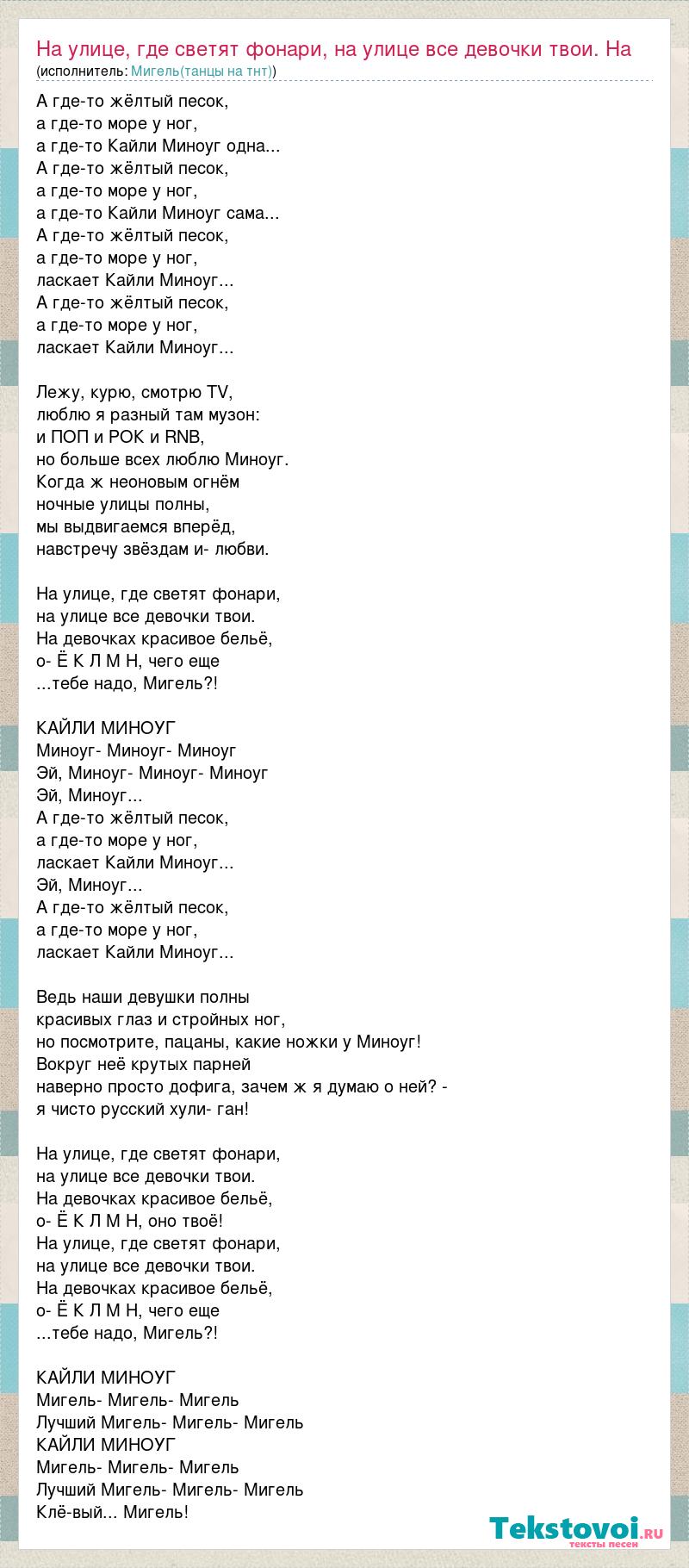 А где-то жёлтый песок, а где-то море у ног, а где-то Кайли Миноуг одна... А где-то жёлтый песок, а где-то море у ног, а где-то Кайли Миноуг сама... А где-то жёлтый песок, а где-то море у ног, ласкает Кайли Миноуг... А где-то жёлтый песок, а где-то море у ног, ласкает Кайли Миноуг... Лежу, курю, смотрю TV, люблю я разный там музон: и ПОП и РОК и RNB, но больше всех люблю Миноуг. Когда ж неоновым огнём ночные улицы полны, мы выдвигаемся вперёд, навстречу звёздам и- любви. На улице, где светят фонари, на улице все девочки твои. На девочках красивое бельё, о- Ё К Л М Н, чего еще ...тебе надо, Мигель?! КАЙЛИ МИНОУГ Миноуг- Миноуг- Миноуг Эй, Миноуг- Миноуг- Миноуг Эй, Миноуг... А где-то жёлтый песок, а где-то море у ног, ласкает Кайли Миноуг... Эй, Миноуг... А где-то жёлтый песок, а где-то море у ног, ласкает Кайли Миноуг... Ведь наши девушки полны красивых глаз и стройных ног, но посмотрите, пацаны, какие ножки у Миноуг! Вокруг неё крутых парней наверно просто дофига, зачем ж я думаю о ней? - я чисто русский хули- ган! На улице, где светят фонари, на улице все девочки твои. На девочках красивое бельё, о- Ё К Л М Н, оно твоё! На улице, где светят фонари, на улице все девочки твои. На девочках красивое бельё, о- Ё К Л М Н, чего еще ...тебе надо, Мигель?! КАЙЛИ МИНОУГ Мигель- Мигель- Мигель Лучший Мигель- Мигель- Мигель КАЙЛИ МИНОУГ Мигель- Мигель- Мигель Лучший Мигель- Мигель- Мигель Клё-вый... Мигель!
