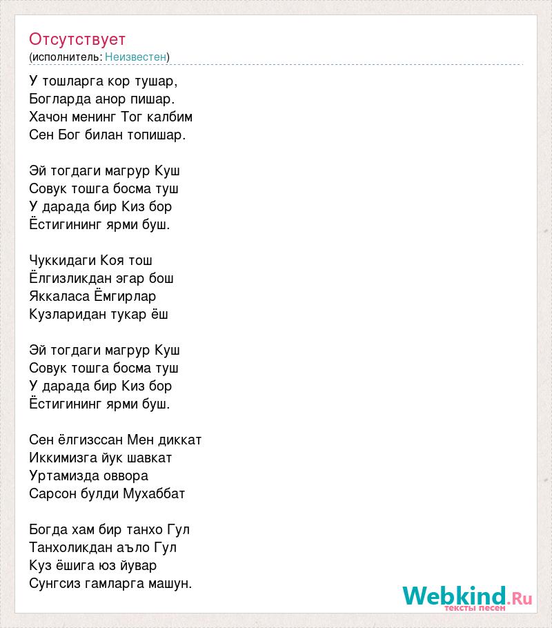 У тошларга кор тушар, Бoгларда анор пишар. Xачон менинг Тог калбим Сен Бог билан топишар. Эй тогдаги магрур Куш Совук тошга босма туш У дарада бир Киз бор Ёстигининг ярми буш. Чуккидаги Коя тош Ёлгизликдан эгар бош Яккаласа Ёмгирлар Кузларидан тукар ёш Эй тогдаги магрур Куш Совук тошга босма туш У дарада бир Киз бор Ёстигининг ярми буш. Сен ёлгизссан Мен диккат Иккимизга йук шавкат Уртамизда оввора Сарсон булди Мухаббат Богда хам бир танхо Гул Танхоликдан аъло Гул Куз ёшига юз йувар Сунгсиз гамларга машун.