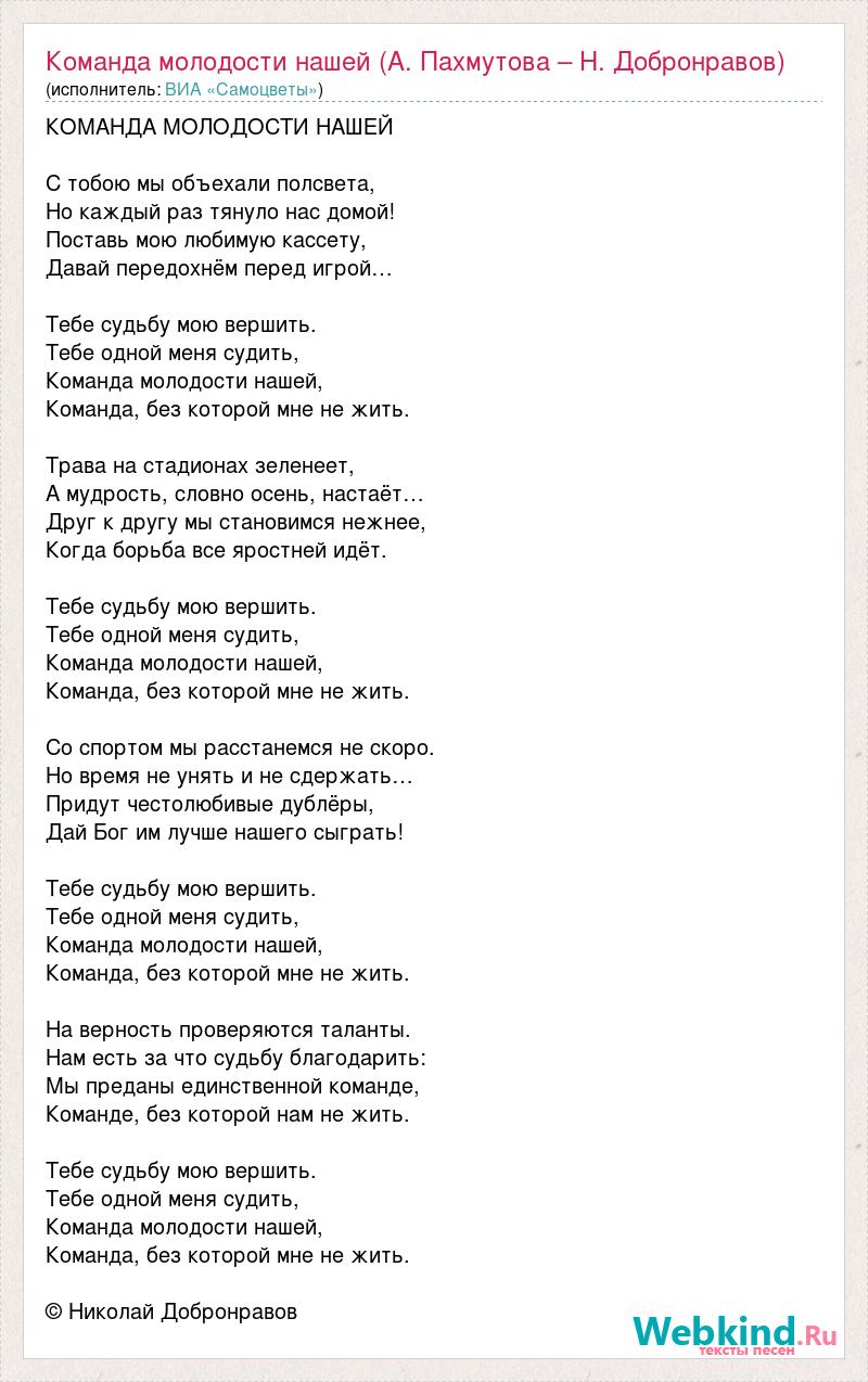 КОМАНДА МОЛОДОСТИ НАШЕЙ С тобою мы объехали полсвета, Но каждый раз тянуло нас домой! Поставь мою любимую кассету, Давай передохнём перед игрой… Тебе судьбу мою вершить. Тебе одной меня судить, Команда молодости нашей, Команда, без которой мне не жить. Трава на стадионах зеленеет, А мудрость, словно осень, настаёт… Друг к другу мы становимся нежнее, Когда борьба все яростней идёт. Тебе судьбу мою вершить. Тебе одной меня судить, Команда молодости нашей, Команда, без которой мне не жить. Со спортом мы расстанемся не скоро. Но время не унять и не сдержать… Придут честолюбивые дублёры, Дай Бог им лучше нашего сыграть! Тебе судьбу мою вершить. Тебе одной меня судить, Команда молодости нашей, Команда, без которой мне не жить. На верность проверяются таланты. Нам есть за что судьбу благодарить: Мы преданы единственной команде, Команде, без которой нам не жить. Тебе судьбу мою вершить. Тебе одной меня судить, Команда молодости нашей, Команда, без которой мне не жить. © Николай Добронравов