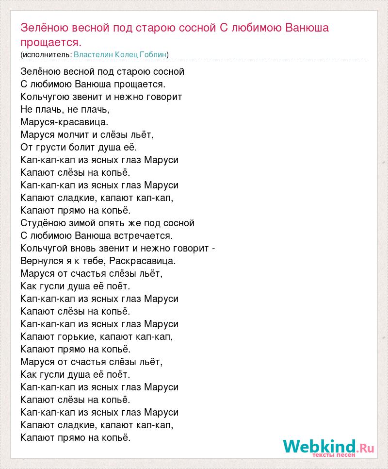Зелёною весной под старою сосной С любимою Ванюша прощается. Кольчугою звенит и нежно говорит Не плачь, не плачь, Маруся-красавица. Маруся молчит и слёзы льёт, От грусти болит душа её. Кап-кап-кап из ясных глаз Маруси Капают слёзы на копьё. Кап-кап-кап из ясных глаз Маруси Капают сладкие, капают кап-кап, Капают прямо на копьё. Студёною зимой опять же под сосной С любимою Ванюша встречается. Кольчугой вновь звенит и нежно говорит - Вернулся я к тебе, Раскрасавица. Маруся от счастья слёзы льёт, Как гусли душа её поёт. Кап-кап-кап из ясных глаз Маруси Капают слёзы на копьё. Кап-кап-кап из ясных глаз Маруси Капают горькие, капают кап-кап, Капают прямо на копьё. Маруся от счастья слёзы льёт, Как гусли душа её поёт. Кап-кап-кап из ясных глаз Маруси Капают слёзы на копьё. Кап-кап-кап из ясных глаз Маруси Капают сладкие, капают кап-кап, Капают прямо на копьё.