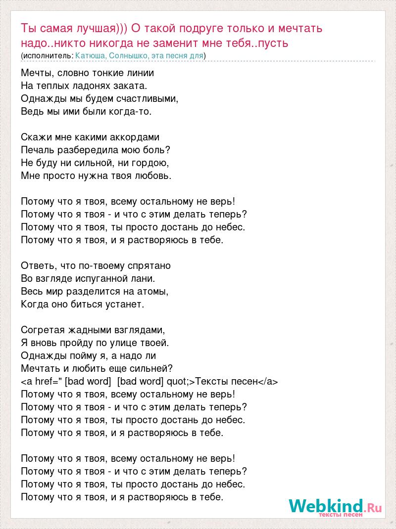Мечты, словно тонкие линии На теплых ладонях заката. Однажды мы будем счастливыми, Ведь мы ими были когда-то. Скажи мне какими аккордами Печаль разбередила мою боль? Не буду ни сильной, ни гордою, Мне просто нужна твоя любовь. Потому что я твоя, всему остальному не верь! Потому что я твоя - и что с этим делать теперь? Потому что я твоя, ты просто достань до небес. Потому что я твоя, и я растворяюсь в тебе. Ответь, что по-твоему спрятано Во взгляде испуганной лани. Весь мир разделится на атомы, Когда оно биться устанет. Согретая жадными взглядами, Я вновь пройду по улице твоей. Однажды пойму я, а надо ли Мечтать и любить еще сильней? <a href=" [bad word] [bad word] quot;>Тексты песен</a> Потому что я твоя, всему остальному не верь! Потому что я твоя - и что с этим делать теперь? Потому что я твоя, ты просто достань до небес. Потому что я твоя, и я растворяюсь в тебе. Потому что я твоя, всему остальному не верь! Потому что я твоя - и что с этим делать теперь? Потому что я твоя, ты просто достань до небес. Потому что я твоя, и я растворяюсь в тебе.
