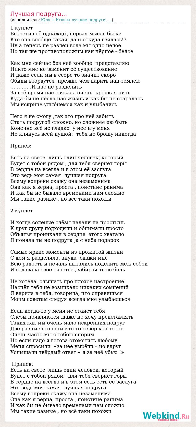 1 куплет Встретив её однажды, первая мысль была: Кто она вообще такая, да и откуда взялась!? Ну а теперь не разлей вода мы одно целое Но так же противоположны как чёрное - белое Как мне сейчас без неё вообще представляю Никто мне не заменит её существование И даже если мы в ссоре то значит скоро Обиды взорвутся ,прежде чем парить над землёю ………….И нас не разделить За всё время нас связала очень крепкая нить Куда бы не несла нас жизнь и как бы не старалась Мы искрине улыбнёмся как и улыбались Чего я не смогу ,так это про неё забыть Стать подругой сложно, но сложнее ею быть Конечно всё не гладко у неё и у меня Но клянусь всей душой: тебя не брошу никогда Припев: Есть на свете лишь один человек, который Будет с тобой рядом , для тебя свернёт горы В сердце на всегда и в этом её заслуга Это ведь моя самая лучшая подруга Всему вопреки скажу она незаменима Она как я верна, проста , поистине ранима И как бы не бывало временами нам сложно Мы такие разные , но всё таки похожи 2 куплет И когда солёные слёзы падали на простынь К друг другу подходили и обнимали просто Объятья проникали в сердце этого хватало Я поняла ты не подруга ,а с неба подарок Самые яркие моменты из прожитой жизни С кем я разделяла, анука скажи мне Всю радость и печаль пытались поделить меж собой Я отдавала своё счастье ,забирая твою боль Не хотела слышать про плохое настроение Насчёт тебя не возникало никаких сомнений Я верила в тебя, говорила, что справишься Моим советам следуя всегда мне улыбаешься Если когда-то у меня не станет тебя Слёзы появляются ,даже не хочу представлять Таких как мы очень мало искренних подруг Две разные стороны кто-то север кто-то юг. Очень часто мы с тобою спорим Но если надо я готова отомстить любому Меня спросили :«за неё умрёшь»,но вдруг Услышали твёрдый ответ « я за неё убью !» Припев: Есть на свете лишь один человек, который Будет с тобой рядом , для тебя свернёт горы В сердце на всегда и в этом есть есть её заслуга Это ведь моя самая лучшая подруга Всему вопреки скажу она незаменима Она как я верна, проста , поистине ранима И как бы не бывало временами нам сложно Мы такие разные , но всё таки похожи