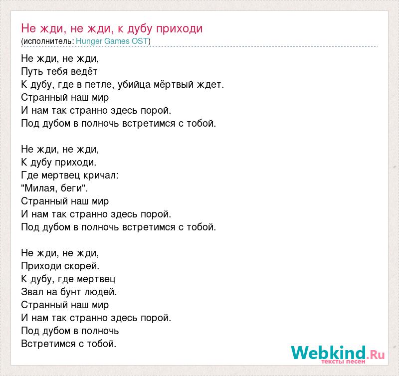 Не жди, не жди, Путь тебя ведёт К дубу, где в петле, убийца мёртвый ждет. Странный наш мир И нам так странно здесь порой. Под дубом в полночь встретимся с тобой. Не жди, не жди, К дубу приходи. Где мертвец кричал: "Милая, беги". Странный наш мир И нам так странно здесь порой. Под дубом в полночь встретимся с тобой. Не жди, не жди, Приходи скорей. К дубу, где мертвец Звал на бунт людей. Странный наш мир И нам так странно здесь порой. Под дубом в полночь Встретимся с тобой.