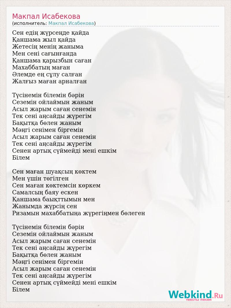 Сен едің жүрсеңде қайда Қаншама жыл қайда Жетесің менің жаныма Мен сені сағынғанда Қаншама қарызбын саған Махаббатың маған Әлемде ең сұлу салған Жалғыз маған арналған Түсінемін білемін бәрін Сеземін ойлаймын жаным Асыл жарым саған сенемін Тек сені аңсайды жүрегім Бақытқа бөлен жаным Мәңгі сенімен біргемін Асыл жарым саған сенемін Тек сені аңсайды жүрегім Сенен артық сүймейді мені ешкім Білем Сен маған шуақсың көктем Мен үшін төгілген Сен маған көктемсін көркем Самалсың баяу ескен Қаншама баықттымын мен Жанымда жүрсің сен Ризамын махаббатыңа жүрегіңмен бөлеген Түсінемін білемін бәрін Сеземін ойлаймын жаным Асыл жарым саған сенемін Тек сені аңсайды жүрегім Бақытқа бөлен жаным Мәңгі сенімен біргемін Асыл жарым саған сенемін Тек сені аңсайды жүрегім Сенен артық сүймейді мені ешкім Білем