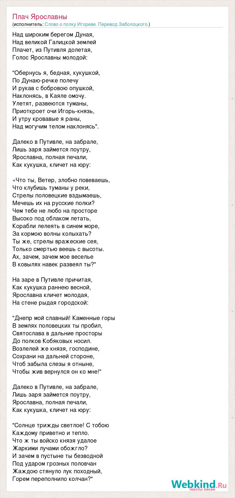 Над широким берегом Дуная, Над великой Галицкой землей Плачет, из Путивля долетая, Голос Ярославны молодой: "Обернусь я, бедная, кукушкой, По Дунаю-речке полечу И рукав с бобровою опушкой, Наклонясь, в Каяле омочу. Улетят, развеются туманы, Приоткроет очи Игорь-князь, И утру кровавые я раны, Над могучим телом наклонясь". Далеко в Путивле, на забрале, Лишь заря займется поутру, Ярославна, полная печали, Как кукушка, кличет на юру: «Что ты, Ветер, злобно повеваешь, Что клубишь туманы у реки, Стрелы половецкие вздымаешь, Мечешь их на русские полки? Чем тебе не любо на просторе Высоко под облаком летать, Корабли лелеять в синем море, За кормою волны колыхать? Ты же, стрелы вражеские сея, Только смертью веешь с высоты. Ах, зачем, зачем мое веселье В ковылях навек развеял ты?" На заре в Путивле причитая, Как кукушка раннею весной, Ярославна кличет молодая, На стене рыдая городской: "Днепр мой славный! Каменные горы В землях половецких ты пробил, Святослава в дальние просторы До полков Кобяковых носил. Возлелей же князя, господине, Сохрани на дальней стороне, Чтоб забыла слезы я отныне, Чтобы жив вернулся он ко мне!" Далеко в Путивле, на забрале, Лишь заря займется поутру, Ярославна, полная печали, Как кукушка, кличет на юру: "Солнце трижды светлое! С тобою Каждому приветно и тепло. Что ж ты войско князя удалое Жаркими лучами обожгло? И зачем в пустыне ты безводной Под ударом грозных половчан Жаждою стянуло лук походный, Горем переполнило колчан?"