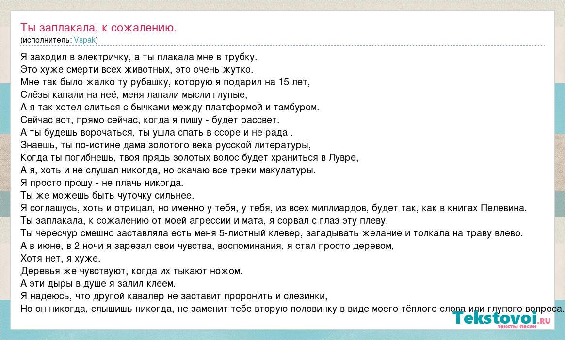 Я заходил в электричку, а ты плакала мне в трубку. Это хуже смерти всех животных, это очень жутко. Мне так было жалко ту рубашку, которую я подарил на 15 лет, Слёзы капали на неё, меня лапали мысли глупые, А я так хотел слиться с бычками между платформой и тамбуром. Сейчас вот, прямо сейчас, когда я пишу - будет рассвет. А ты будешь ворочаться, ты ушла спать в ссоре и не рада . Знаешь, ты по-истине дама золотого века русской литературы, Когда ты погибнешь, твоя прядь золотых волос будет храниться в Лувре, А я, хоть и не слушал никогда, но скачаю все треки макулатуры. Я просто прошу - не плачь никогда. Ты же можешь быть чуточку сильнее. Я соглашусь, хоть и отрицал, но именно у тебя, у тебя, из всех миллиардов, будет так, как в книгах Пелевина. Ты заплакала, к сожалению от моей агрессии и мата, я сорвал с глаз эту плеву, Ты чересчур смешно заставляла есть меня 5-листный клевер, загадывать желание и толкала на траву влево. А в июне, в 2 ночи я зарезал свои чувства, воспоминания, я стал просто деревом, Хотя нет, я хуже. Деревья же чувствуют, когда их тыкают ножом. А эти дыры в душе я залил клеем. Я надеюсь, что другой кавалер не заставит проронить и слезинки, Но он никогда, слышишь никогда, не заменит тебе вторую половинку в виде моего тёплого слова или глупого вопроса.