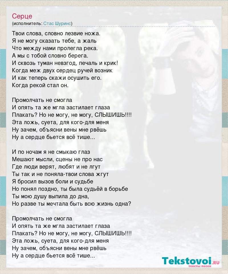 Твои слова, словно лезвие ножа. Я не могу сказать тебе, а жаль Что между нами пролегла река. А мы с тобой словно берега. И сквозь туман невзгод, печаль и крик! Когда меж двух сердец ручей возник И как теперь скажи осушить его. Когда рекой стал он. Промолчать не смогла И опять та же мгла застилает глаза Плакать? Но не могу, не могу, СЛЫШИШЬ!!!! Эта ложь, суета, для кого-для меня Ну зачем, объясни вены мне рвёшь Ну а сердце бьется всё тише... И по ночам я не смыкаю глаз Мешают мысли, сцены не про нас Где люди верят, любят и не лгут Ты так и не поняла-твои слова жгут Я бросил вызов боли и судьбе Но понял поздно, ты была судьёй в борьбе Ты мою душу выпила до дна, Но разве ты мечтала быть всю жизнь одна? Промолчать не смогла И опять та же мгла застилает глаза Плакать? Но не могу, не могу, СЛЫШИШЬ!!!! Эта ложь, суета, для кого-для меня Ну зачем, объясни вены мне рвёшь Ну а сердце бьется всё тише...