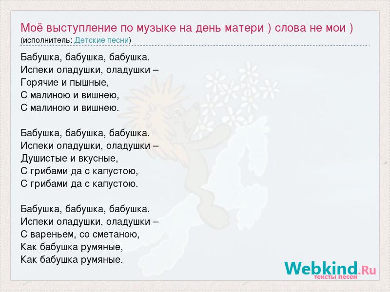 Бабушка, бабушка, бабушка. Испеки оладушки, оладушки – Горячие и пышные, С малиною и вишнею, С малиною и вишнею. Бабушка, бабушка, бабушка. Испеки оладушки, оладушки – Душистые и вкусные, С грибами да с капустою, С грибами да с капустою. Бабушка, бабушка, бабушка. Испеки оладушки, оладушки – С вареньем, со сметаною, Как бабушка румяные, Как бабушка румяные.