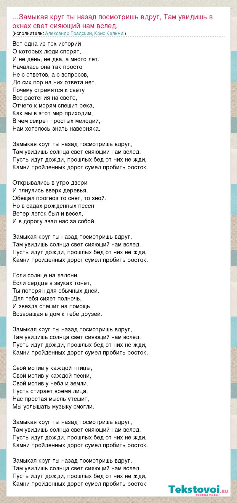 Вот одна из тех историй О которых люди спорят, И не день, не два, а много лет. Началась она так просто Не с ответов, а с вопросов, До сих пор на них ответа нет. Почему стремятся к свету Все растения на свете, Отчего к морям спешит река, Как мы в этот мир приходим, В чем секрет простых мелодий, Нам хотелось знать наверняка. Замыкая круг ты назад посмотришь вдруг, Там увидишь солнца свет сияющий нам вслед. Пусть идут дожди, прошлых бед от них не жди, Камни пройденных дорог сумел пробить росток. Открывались в утро двери И тянулись вверх деревья, Обещал прогноз то снег, то зной. Но в садах рожденных песен Ветер легок был и весел, И в дорогу звал нас за собой. Замыкая круг ты назад посмотришь вдруг, Там увидишь солнца свет сияющий нам вслед. Пусть идут дожди, прошлых бед от них не жди, Камни пройденных дорог сумел пробить росток. Если солнце на ладони, Если сердце в звуках тонет, Ты потерян для обычных дней. Для тебя сияет полночь, И звезда спешит на помощь, Возвращая в дом к тебе друзей. Замыкая круг ты назад посмотришь вдруг, Там увидишь солнца свет сияющий нам вслед. Пусть идут дожди, прошлых бед от них не жди, Камни пройденных дорог сумел пробить росток. Свой мотив у каждой птицы, Свой мотив у каждой песни, Свой мотив у неба и земли. Пусть стирает время лица, Нас простая мысль утешит, Мы услышать музыку смогли. Замыкая круг ты назад посмотришь вдруг, Там увидишь солнца свет сияющий нам вслед. Пусть идут дожди, прошлых бед от них не жди, Камни пройденных дорог сумел пробить росток. Замыкая круг ты назад посмотришь вдруг, Там увидишь солнца свет сияющий нам вслед. Пусть идут дожди, прошлых бед от них не жди, Камни пройденных дорог сумел пробить росток