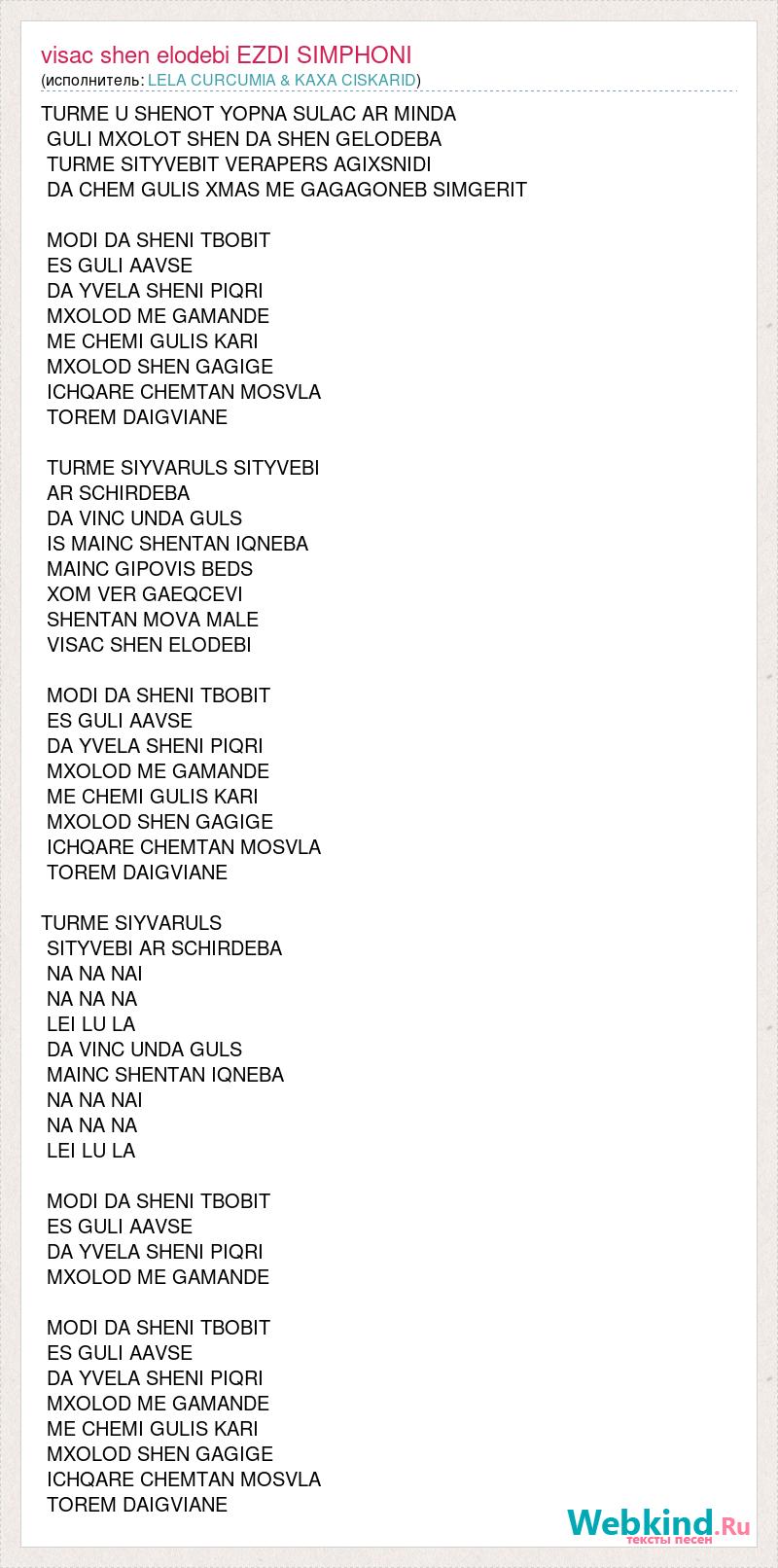 TURME U SHENOT YOPNA SULAC AR MINDA GULI MXOLOT SHEN DA SHEN GELODEBA TURME SITYVEBIT VERAPERS AGIXSNIDI DA CHEM GULIS XMAS ME GAGAGONEB SIMGERIT MODI DA SHENI TBOBIT ES GULI AAVSE DA YVELA SHENI PIQRI MXOLOD ME GAMANDE ME CHEMI GULIS KARI MXOLOD SHEN GAGIGE ICHQARE CHEMTAN MOSVLA TOREM DAIGVIANE TURME SIYVARULS SITYVEBI AR SCHIRDEBA DA VINC UNDA GULS IS MAINC SHENTAN IQNEBA MAINC GIPOVIS BEDS XOM VER GAEQCEVI SHENTAN MOVA MALE VISAC SHEN ELODEBI MODI DA SHENI TBOBIT ES GULI AAVSE DA YVELA SHENI PIQRI MXOLOD ME GAMANDE ME CHEMI GULIS KARI MXOLOD SHEN GAGIGE ICHQARE CHEMTAN MOSVLA TOREM DAIGVIANE TURME SIYVARULS SITYVEBI AR SCHIRDEBA NA NA NAI NA NA NA LEI LU LA DA VINC UNDA GULS MAINC SHENTAN IQNEBA NA NA NAI NA NA NA LEI LU LA MODI DA SHENI TBOBIT ES GULI AAVSE DA YVELA SHENI PIQRI MXOLOD ME GAMANDE MODI DA SHENI TBOBIT ES GULI AAVSE DA YVELA SHENI PIQRI MXOLOD ME GAMANDE ME CHEMI GULIS KARI MXOLOD SHEN GAGIGE ICHQARE CHEMTAN MOSVLA TOREM DAIGVIANE