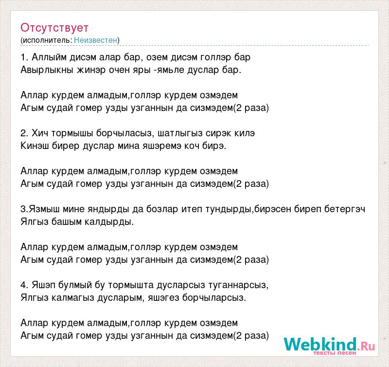 1. Аллыйм дисэм алар бар, озем дисэм голлэр бар Авырлыкны жинэр очен яры -ямьле дуслар бар. Аллар курдем алмадым,голлэр курдем озмэдем Агым судай гомер узды узганнын да сизмэдем(2 раза) 2. Хич тормышы борчыласыз, шатлыгыз сирэк килэ Кинэш бирер дуслар мина яшэремэ коч бирэ. Аллар курдем алмадым,голлэр курдем озмэдем Агым судай гомер узды узганнын да сизмэдем(2 раза) 3.Язмыш мине яндырды да бозлар итеп тундырды,бирэсен биреп бетергэч Ялгыз башым калдырды. Аллар курдем алмадым,голлэр курдем озмэдем Агым судай гомер узды узганнын да сизмэдем(2 раза) 4. Яшэп булмый бу тормышта дусларсыз туганнарсыз, Ялгыз калмагыз дусларым, яшэгез борчыларсыз. Аллар курдем алмадым,голлэр курдем озмэдем Агым судай гомер узды узганнын да сизмэдем(2 раза)