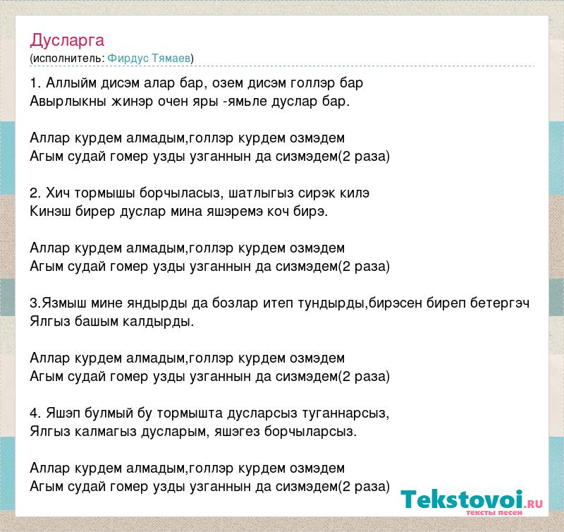1. Аллыйм дисэм алар бар, озем дисэм голлэр бар Авырлыкны жинэр очен яры -ямьле дуслар бар. Аллар курдем алмадым,голлэр курдем озмэдем Агым судай гомер узды узганнын да сизмэдем(2 раза) 2. Хич тормышы борчыласыз, шатлыгыз сирэк килэ Кинэш бирер дуслар мина яшэремэ коч бирэ. Аллар курдем алмадым,голлэр курдем озмэдем Агым судай гомер узды узганнын да сизмэдем(2 раза) 3.Язмыш мине яндырды да бозлар итеп тундырды,бирэсен биреп бетергэч Ялгыз башым калдырды. Аллар курдем алмадым,голлэр курдем озмэдем Агым судай гомер узды узганнын да сизмэдем(2 раза) 4. Яшэп булмый бу тормышта дусларсыз туганнарсыз, Ялгыз калмагыз дусларым, яшэгез борчыларсыз. Аллар курдем алмадым,голлэр курдем озмэдем Агым судай гомер узды узганнын да сизмэдем(2 раза)