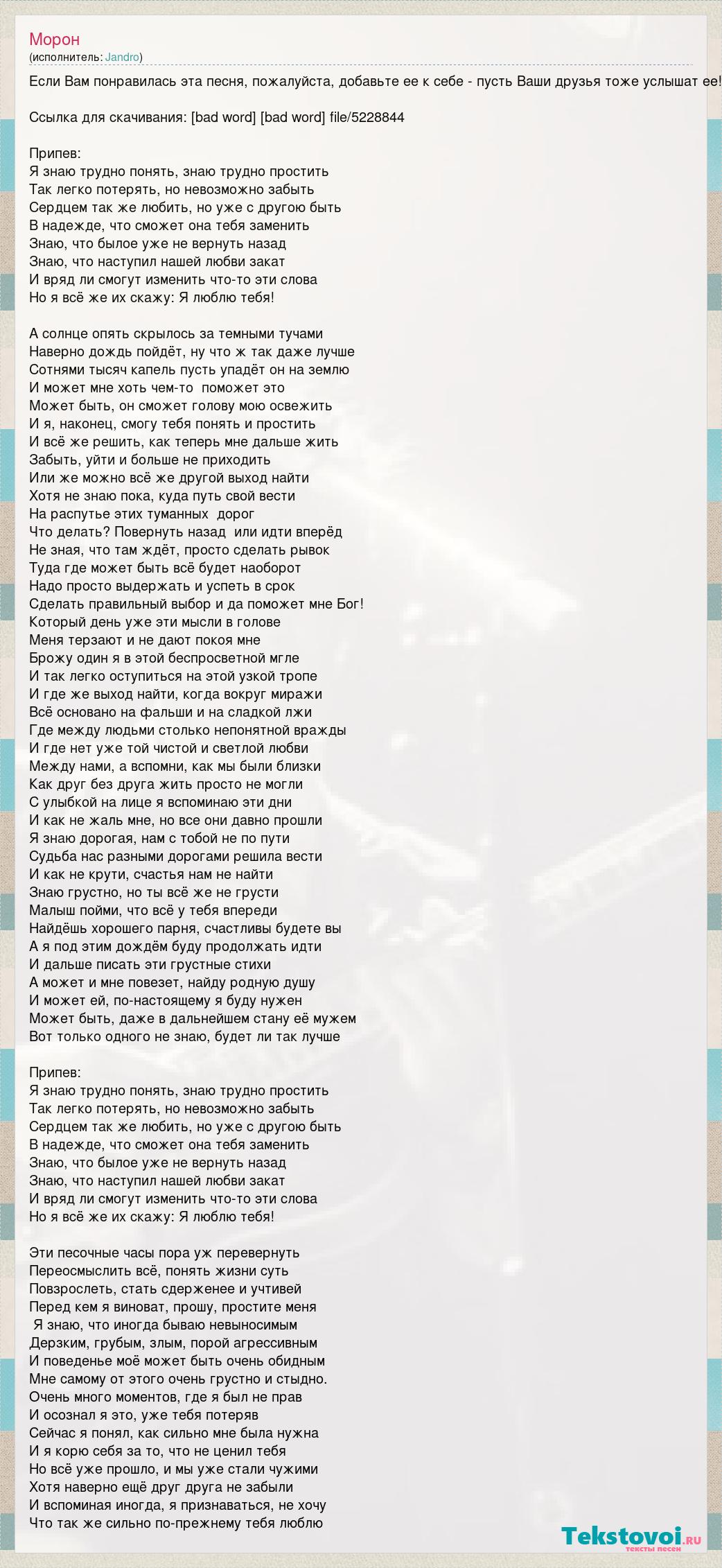 Если Вам понравилась эта песня, пожалуйста, добавьте ее к себе - пусть Ваши друзья тоже услышат ее! Ссылка для скачивания: [bad word] [bad word] file/5228844 Припев: Я знаю трудно понять, знаю трудно простить Так легко потерять, но невозможно забыть Сердцем так же любить, но уже с другою быть В надежде, что сможет она тебя заменить Знаю, что былое уже не вернуть назад Знаю, что наступил нашей любви закат И вряд ли смогут изменить что-то эти слова Но я всё же их скажу: Я люблю тебя! А солнце опять скрылось за темными тучами Наверно дождь пойдёт, ну что ж так даже лучше Сотнями тысяч капель пусть упадёт он на землю И может мне хоть чем-то поможет это Может быть, он сможет голову мою освежить И я, наконец, смогу тебя понять и простить И всё же решить, как теперь мне дальше жить Забыть, уйти и больше не приходить Или же можно всё же другой выход найти Хотя не знаю пока, куда путь свой вести На распутье этих туманных дорог Что делать? Повернуть назад или идти вперёд Не зная, что там ждёт, просто сделать рывок Туда где может быть всё будет наоборот Надо просто выдержать и успеть в срок Сделать правильный выбор и да поможет мне Бог! Который день уже эти мысли в голове Меня терзают и не дают покоя мне Брожу один я в этой беспросветной мгле И так легко оступиться на этой узкой тропе И где же выход найти, когда вокруг миражи Всё основано на фальши и на сладкой лжи Где между людьми столько непонятной вражды И где нет уже той чистой и светлой любви Между нами, а вспомни, как мы были близки Как друг без друга жить просто не могли С улыбкой на лице я вспоминаю эти дни И как не жаль мне, но все они давно прошли Я знаю дорогая, нам с тобой не по пути Судьба нас разными дорогами решила вести И как не крути, счастья нам не найти Знаю грустно, но ты всё же не грусти Малыш пойми, что всё у тебя впереди Найдёшь хорошего парня, счастливы будете вы А я под этим дождём буду продолжать идти И дальше писать эти грустные стихи А может и мне повезет, найду родную душу И может ей, по-настоящему я буду нужен Может быть, даже в дальнейшем стану её мужем Вот только одного не знаю, будет ли так лучше Припев: Я знаю трудно понять, знаю трудно простить Так легко потерять, но невозможно забыть Сердцем так же любить, но уже с другою быть В надежде, что сможет она тебя заменить Знаю, что былое уже не вернуть назад Знаю, что наступил нашей любви закат И вряд ли смогут изменить что-то эти слова Но я всё же их скажу: Я люблю тебя! Эти песочные часы пора уж перевернуть Переосмыслить всё, понять жизни суть Повзрослеть, стать сдерженее и учтивей Перед кем я виноват, прошу, простите меня Я знаю, что иногда бываю невыносимым Дерзким, грубым, злым, порой агрессивным И поведенье моё может быть очень обидным Мне самому от этого очень грустно и стыдно. Очень много моментов, где я был не прав И осознал я это, уже тебя потеряв Сейчас я понял, как сильно мне была нужна И я корю себя за то, что не ценил тебя Но всё уже прошло, и мы уже стали чужими Хотя наверно ещё друг друга не забыли И вспоминая иногда, я признаваться, не хочу Что так же сильно по-прежнему тебя люблю
