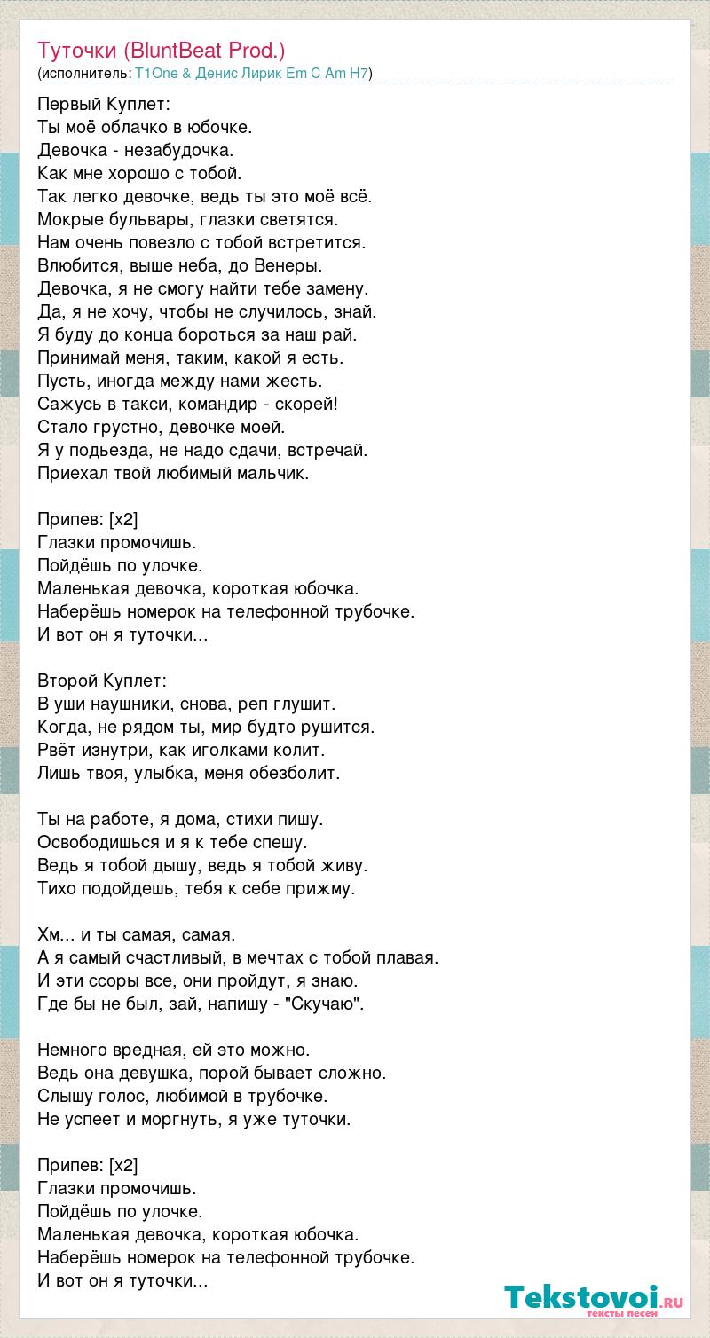 Первый Куплет: Ты моё облачко в юбочке. Девочка - незабудочка. Как мне хорошо с тобой. Так легко девочке, ведь ты это моё всё. Мокрые бульвары, глазки светятся. Нам очень повезло с тобой встретится. Влюбится, выше неба, до Венеры. Девочка, я не смогу найти тебе замену. Да, я не хочу, чтобы не случилось, знай. Я буду до конца бороться за наш рай. Принимай меня, таким, какой я есть. Пусть, иногда между нами жесть. Сажусь в такси, командир - скорей! Стало грустно, девочке моей. Я у подьезда, не надо сдачи, встречай. Приехал твой любимый мальчик. Припев: [х2] Глазки промочишь. Пойдёшь по улочке. Маленькая девочка, короткая юбочка. Наберёшь номерок на телефонной трубочке. И вот он я туточки... Второй Куплет: В уши наушники, снова, реп глушит. Когда, не рядом ты, мир будто рушится. Рвёт изнутри, как иголками колит. Лишь твоя, улыбка, меня обезболит. Ты на работе, я дома, стихи пишу. Освободишься и я к тебе спешу. Ведь я тобой дышу, ведь я тобой живу. Тихо подойдешь, тебя к себе прижму. Хм... и ты самая, самая. А я самый счастливый, в мечтах с тобой плавая. И эти ссоры все, они пройдут, я знаю. Где бы не был, зай, напишу - "Скучаю". Немного вредная, ей это можно. Ведь она девушка, порой бывает сложно. Слышу голос, любимой в трубочке. Не успеет и моргнуть, я уже туточки. Припев: [х2] Глазки промочишь. Пойдёшь по улочке. Маленькая девочка, короткая юбочка. Наберёшь номерок на телефонной трубочке. И вот он я туточки...
