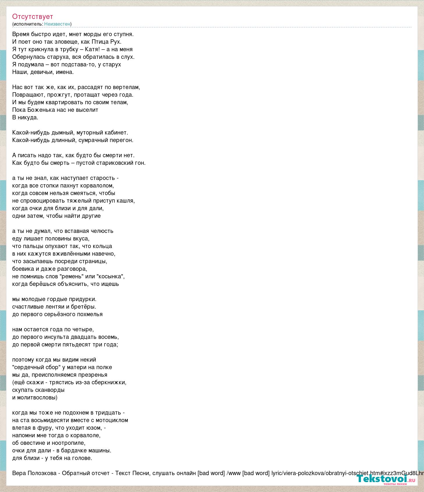 Время быстро идет, мнет морды его ступня. И поет оно так зловеще, как Птица Рух. Я тут крикнула в трубку – Катя! – а на меня Обернулась старуха, вся обратилась в слух. Я подумала – вот подстава-то, у старух Наши, девичьи, имена. Нас вот так же, как их, рассадят по вертелам, Повращают, прожгут, протащат через года. И мы будем квартировать по своим телам, Пока Боженька нас не выселит В никуда. Какой-нибудь дымный, муторный кабинет. Какой-нибудь длинный, сумрачный перегон. А писать надо так, как будто бы смерти нет. Как будто бы смерть – пустой стариковский гон. а ты не знал, как наступает старость - когда все стопки пахнут корвалолом, когда совсем нельзя смеяться, чтобы не спровоцировать тяжелый приступ кашля, когда очки для близи и для дали, одни затем, чтобы найти другие а ты не думал, что вставная челюсть еду лишает половины вкуса, что пальцы опухают так, что кольца в них кажутся вживлёнными навечно, что засыпаешь посреди страницы, боевика и даже разговора, не помнишь слов "ремень" или "косынка", когда берёшься объяснить, что ищешь мы молодые гордые придурки. счастливые лентяи и бретёры. до первого серьёзного похмелья нам остается года по четыре, до первого инсульта двадцать восемь, до первой смерти пятьдесят три года; поэтому когда мы видим некий "сердечный сбор" у матери на полке мы да, преисполняемся презренья (ещё скажи - трястись из-за сберкнижки, скупать сканворды и молитвословы) когда мы тоже не подохнем в тридцать - на ста восьмидесяти вместе с мотоциклом влетая в фуру, что уходит юзом, - напомни мне тогда о корвалоле, об овестине и ноотропиле, очки для дали - в бардачке машины. для близи - у тебя на голове. Вера Полозкова - Обратный отсчет - Текст Песни, слушать онлайн [bad word] /www [bad word] lyric/viera-polozkova/obratnyi-otschiet.htm#ixzz3mGud8Lhr
