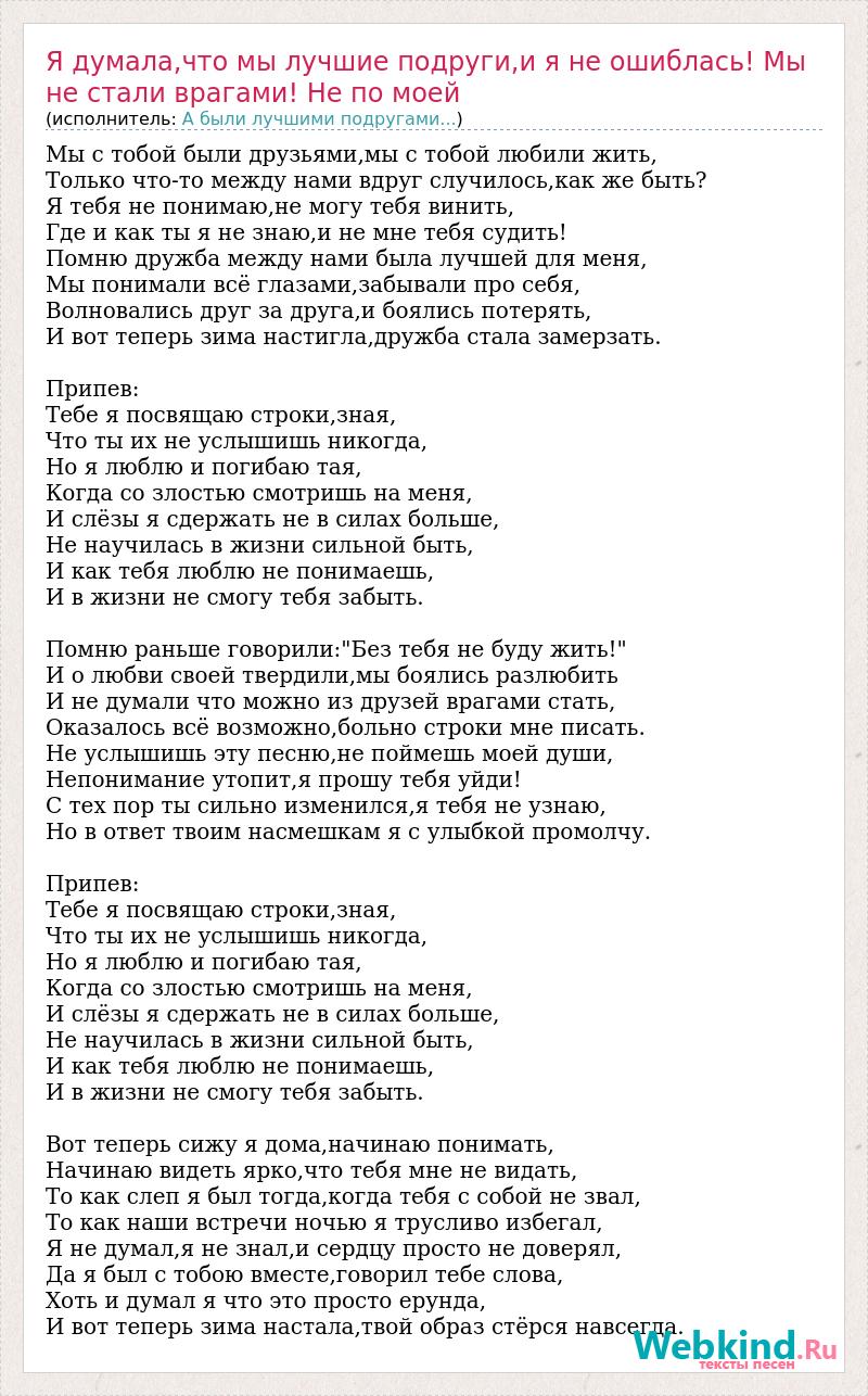 Мы с тобой были друзьями,мы с тобой любили жить, Только что-то между нами вдруг случилось,как же быть? Я тебя не понимаю,не могу тебя винить, Где и как ты я не знаю,и не мне тебя судить! Помню дружба между нами была лучшей для меня, Мы понимали всё глазами,забывали про себя, Волновались друг за друга,и боялись потерять, И вот теперь зима настигла,дружба стала замерзать. Припев: Тебе я посвящаю строки,зная, Что ты их не услышишь никогда, Но я люблю и погибаю тая, Когда со злостью смотришь на меня, И слёзы я сдержать не в силах больше, Не научилась в жизни сильной быть, И как тебя люблю не понимаешь, И в жизни не смогу тебя забыть. Помню раньше говорили:"Без тебя не буду жить!" И о любви своей твердили,мы боялись разлюбить И не думали что можно из друзей врагами стать, Оказалось всё возможно,больно строки мне писать. Не услышишь эту песню,не поймешь моей души, Непонимание утопит,я прошу тебя уйди! С тех пор ты сильно изменился,я тебя не узнаю, Но в ответ твоим насмешкам я с улыбкой промолчу. Припев: Тебе я посвящаю строки,зная, Что ты их не услышишь никогда, Но я люблю и погибаю тая, Когда со злостью смотришь на меня, И слёзы я сдержать не в силах больше, Не научилась в жизни сильной быть, И как тебя люблю не понимаешь, И в жизни не смогу тебя забыть. Вот теперь сижу я дома,начинаю понимать, Начинаю видеть ярко,что тебя мне не видать, То как слеп я был тогда,когда тебя с собой не звал, То как наши встречи ночью я трусливо избегал, Я не думал,я не знал,и сердцу просто не доверял, Да я был с тобою вместе,говорил тебе слова, Хоть и думал я что это просто ерунда, И вот теперь зима настала,твой образ стёрся навсегда.