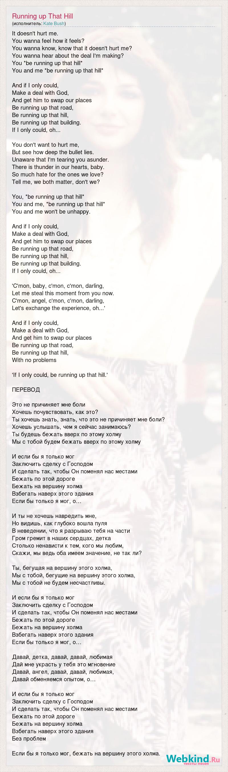 It doesn't hurt me. You wanna feel how it feels? You wanna know, know that it doesn't hurt me? You wanna hear about the deal I'm making? You *be running up that hill* You and me *be running up that hill* And if I only could, Make a deal with God, And get him to swap our places Be running up that road, Be running up that hill, Be running up that building. If I only could, oh... You don't want to hurt me, But see how deep the bullet lies. Unaware that I'm tearing you asunder. There is thunder in our hearts, baby. So much hate for the ones we love? Tell me, we both matter, don't we? You, *be running up that hill* You and me, *be running up that hill* You and me won't be unhappy. And if I only could, Make a deal with God, And get him to swap our places Be running up that road, Be running up that hill, Be running up that building. If I only could, oh... 'C'mon, baby, c'mon, c'mon, darling, Let me steal this moment from you now. C'mon, angel, c'mon, c'mon, darling, Let's exchange the experience, oh...' And if I only could, Make a deal with God, And get him to swap our places Be running up that road, Be running up that hill, With no problems 'If I only could, be running up that hill.' ПЕРЕВОД Это не причиняет мне боли Хочешь почувствовать, как это? Ты хочешь знать, знать, что это не причиняет мне боли? Хочешь услышать, чем я сейчас занимаюсь? Ты будешь бежать вверх по этому холму Мы с тобой будем бежать вверх по этому холму И если бы я только мог Заключить сделку с Господом И сделать так, чтобы Он поменял нас местами Бежать по этой дороге Бежать на вершину холма Взбегать наверх этого здания Если бы только я мог, о… И ты не хочешь навредить мне, Но видишь, как глубоко вошла пуля В неведении, что я разрываю тебя на части Гром гремит в наших сердцах, детка Столько ненависти к тем, кого мы любим, Скажи, мы ведь оба имеем значение, не так ли? Ты, бегущая на вершину этого холма, Мы с тобой, бегущие на вершину этого холма, Мы с тобой не будем несчастливы. И если бы я только мог Заключить сделку с Господом И сделать так, чтобы Он поменял нас местами Бежать по этой дороге Бежать на вершину холма Взбегать наверх этого здания Если бы только я мог, о… Давай, детка, давай, давай, любимая Дай мне украсть у тебя это мгновение Давай, ангел, давай, давай, любимая, Давай обменяемся опытом, о… И если бы я только мог Заключить сделку с Господом И сделать так, чтобы Он поменял нас местами Бежать по этой дороге Бежать на вершину холма Взбегать наверх этого здания Без проблем Если бы я только мог, бежать на вершину этого холма.