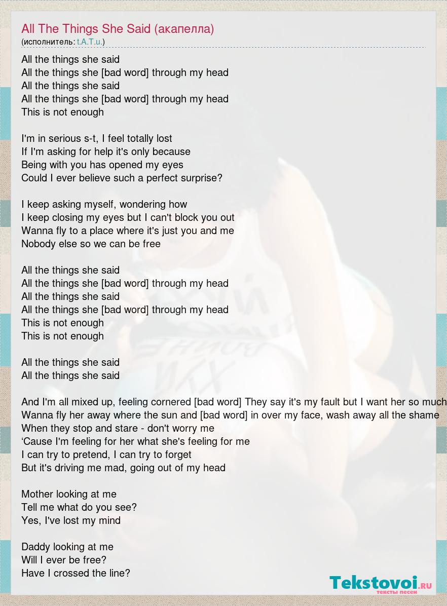 А как ты думаешь, о чем песня "All The Things She Said (акапелла)" ?