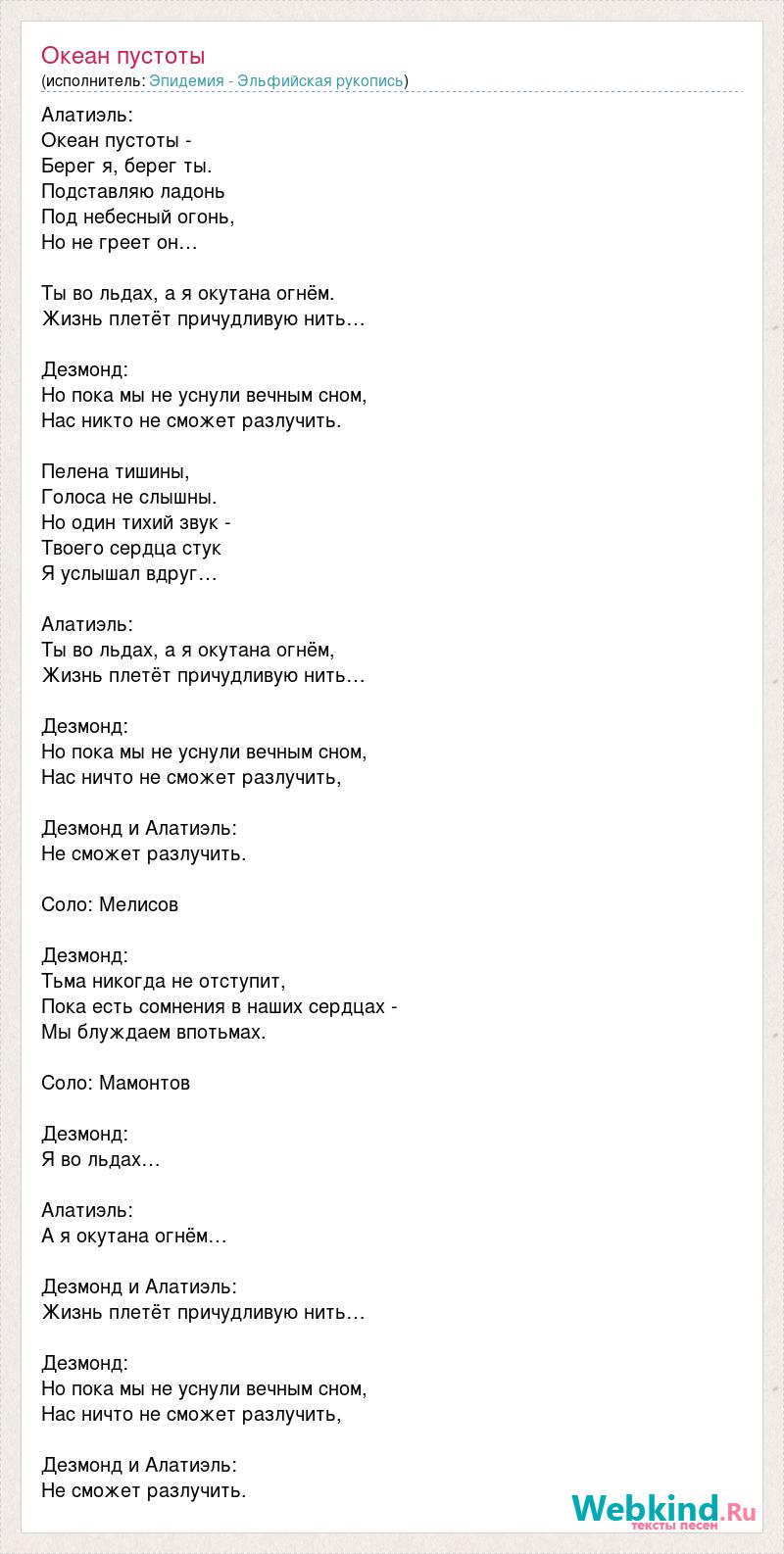 Алатиэль: Океан пустоты - Берег я, берег ты. Подставляю ладонь Под небесный огонь, Но не греет он… Ты во льдах, а я окутана огнём. Жизнь плетёт причудливую нить… Дезмонд: Но пока мы не уснули вечным сном, Нас никто не сможет разлучить. Пелена тишины, Голоса не слышны. Но один тихий звук - Твоего сердца стук Я услышал вдруг… Алатиэль: Ты во льдах, а я окутана огнём, Жизнь плетёт причудливую нить… Дезмонд: Но пока мы не уснули вечным сном, Нас ничто не сможет разлучить, Дезмонд и Алатиэль: Не сможет разлучить. Соло: Мелисов Дезмонд: Тьма никогда не отступит, Пока есть сомнения в наших сердцах - Мы блуждаем впотьмах. Соло: Мамонтов Дезмонд: Я во льдах… Алатиэль: А я окутана огнём… Дезмонд и Алатиэль: Жизнь плетёт причудливую нить… Дезмонд: Но пока мы не уснули вечным сном, Нас ничто не сможет разлучить, Дезмонд и Алатиэль: Не сможет разлучить.