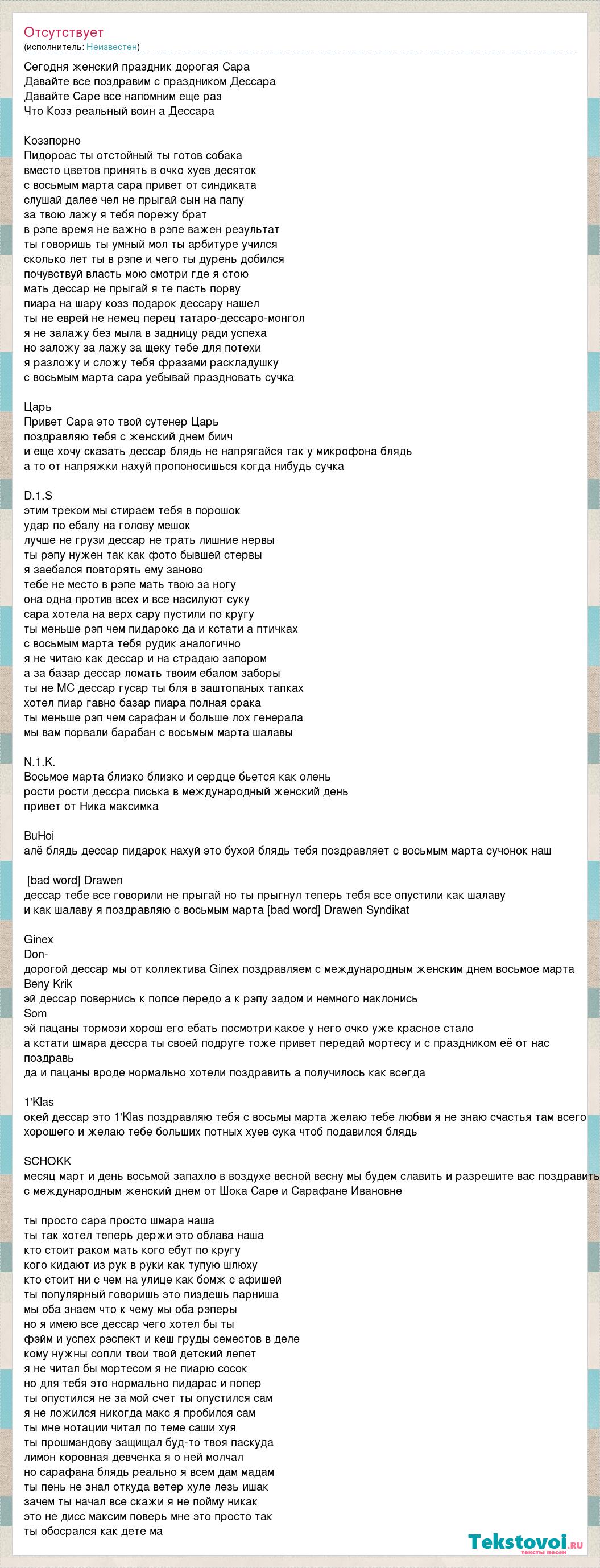 Сегодня женский праздник дорогая Сара Давайте все поздравим с праздником Дессара Давайте Саре все напомним еще раз Что Козз реальный воин а Дессара Коззпорно Пидороас ты отстойный ты готов собака вместо цветов принять в очко хуев десяток с восьмым марта сара привет от синдиката слушай далее чел не прыгай сын на папу за твою лажу я тебя порежу брат в рэпе время не важно в рэпе важен результат ты говоришь ты умный мол ты арбитуре учился сколько лет ты в рэпе и чего ты дурень добился почувствуй власть мою смотри где я стою мать дессар не прыгай я те пасть порву пиара на шару козз подарок дессару нашел ты не еврей не немец перец татаро-дессаро-монгол я не залажу без мыла в задницу ради успеха но заложу за лажу за щеку тебе для потехи я разложу и сложу тебя фразами раскладушку с восьмым марта сара уебывай праздновать сучка Царь Привет Сара это твой сутенер Царь поздравляю тебя с женский днем биич и еще хочу сказать дессар блядь не напрягайся так у микрофона блядь а то от напряжки нахуй пропоносишься когда нибудь сучка D.1.S этим треком мы стираем тебя в порошок удар по ебалу на голову мешок лучше не грузи дессар не трать лишние нервы ты рэпу нужен так как фото бывшей стервы я заебался повторять ему заново тебе не место в рэпе мать твою за ногу она одна против всех и все насилуют суку сара хотела на верх сару пустили по кругу ты меньше рэп чем пидарокс да и кстати а птичках с восьмым марта тебя рудик аналогично я не читаю как дессар и на страдаю запором а за базар дессар ломать твоим ебалом заборы ты не МС дессар гусар ты бля в заштопаных тапках хотел пиар гавно базар пиара полная срака ты меньше рэп чем сарафан и больше лох генерала мы вам порвали барабан с восьмым марта шалавы N.1.K. Восьмое марта близко близко и сердце бьется как олень рости рости дессра писька в международный женский день привет от Ника максимка BuHoi алё блядь дессар пидарок нахуй это бухой блядь тебя поздравляет с восьмым марта сучонок наш Damn Drawen дессар тебе все говорили не прыгай но ты прыгнул теперь тебя все опустили как шалаву и как шалаву я поздравляю с восьмым марта Damn Drawen Syndikat Ginex Don- дорогой дессар мы от коллектива Ginex поздравляем с международным женским днем восьмое марта Beny Krik эй дессар повернись к попсе передо а к рэпу задом и немного наклонись Som эй пацаны тормози хорош его ебать посмотри какое у него очко уже красное стало а кстати шмара дессра ты своей подруге тоже привет передай мортесу и с праздником её от нас поздравь да и пацаны вроде нормально хотели поздравить а получилось как всегда 1'Klas окей дессар это 1'Klas поздравляю тебя с восьмы марта желаю тебе любви я не знаю счастья там всего хорошего и желаю тебе больших потных хуев сука чтоб подавился блядь SCHOKK месяц март и день восьмой запахло в воздухе весной весну мы будем славить и разрешите вас поздравить с международным женский днем от Шока Саре и Сарафане Ивановне ты просто сара просто шмара наша ты так хотел теперь держи это облава наша кто стоит раком мать кого ебут по кругу кого кидают из рук в руки как тупую шлюху кто стоит ни с чем на улице как бомж с афишей ты популярный говоришь это пиздешь парниша мы оба знаем что к чему мы оба рэперы но я имею все дессар чего хотел бы ты фэйм и успех рэспект и кеш груды семестов в деле кому нужны сопли твои твой детский лепет я не читал бы мортесом я не пиарю сосок но для теб