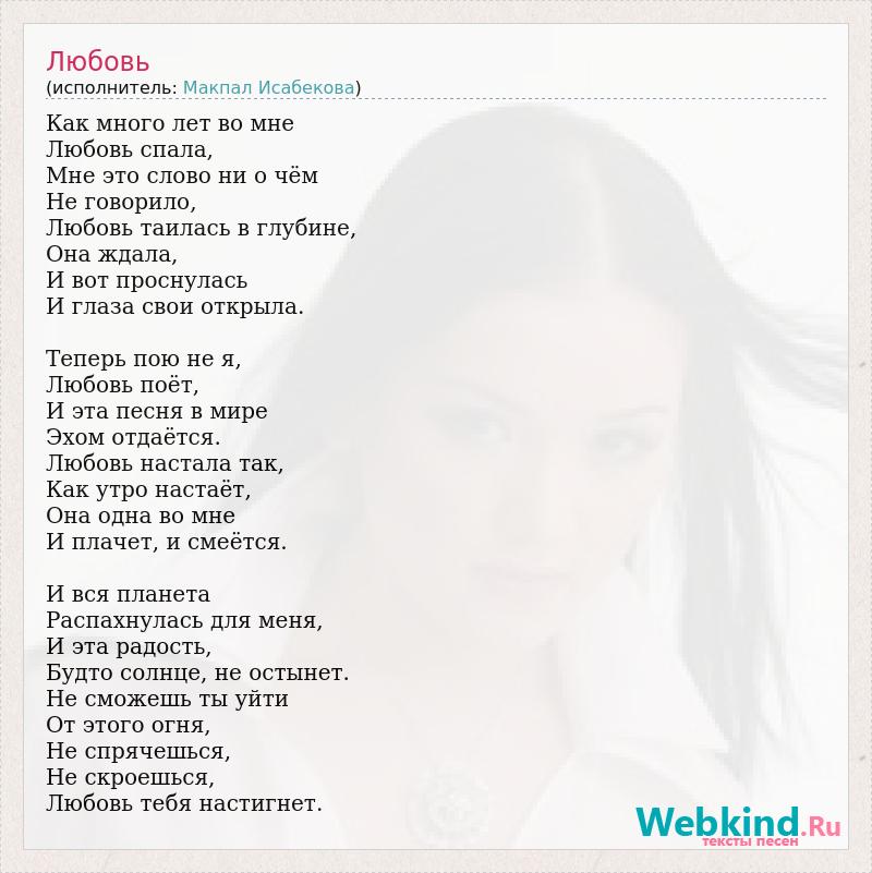 Как много лет во мне Любовь спала, Мне это слово ни о чём Не говорило, Любовь таилась в глубине, Она ждала, И вот проснулась И глаза свои открыла. Теперь пою не я, Любовь поёт, И эта песня в мире Эхом отдаётся. Любовь настала так, Как утро настаёт, Она одна во мне И плачет, и смеётся. И вся планета Распахнулась для меня, И эта радость, Будто солнце, не остынет. Не сможешь ты уйти От этого огня, Не спрячешься, Не скроешься, Любовь тебя настигнет.