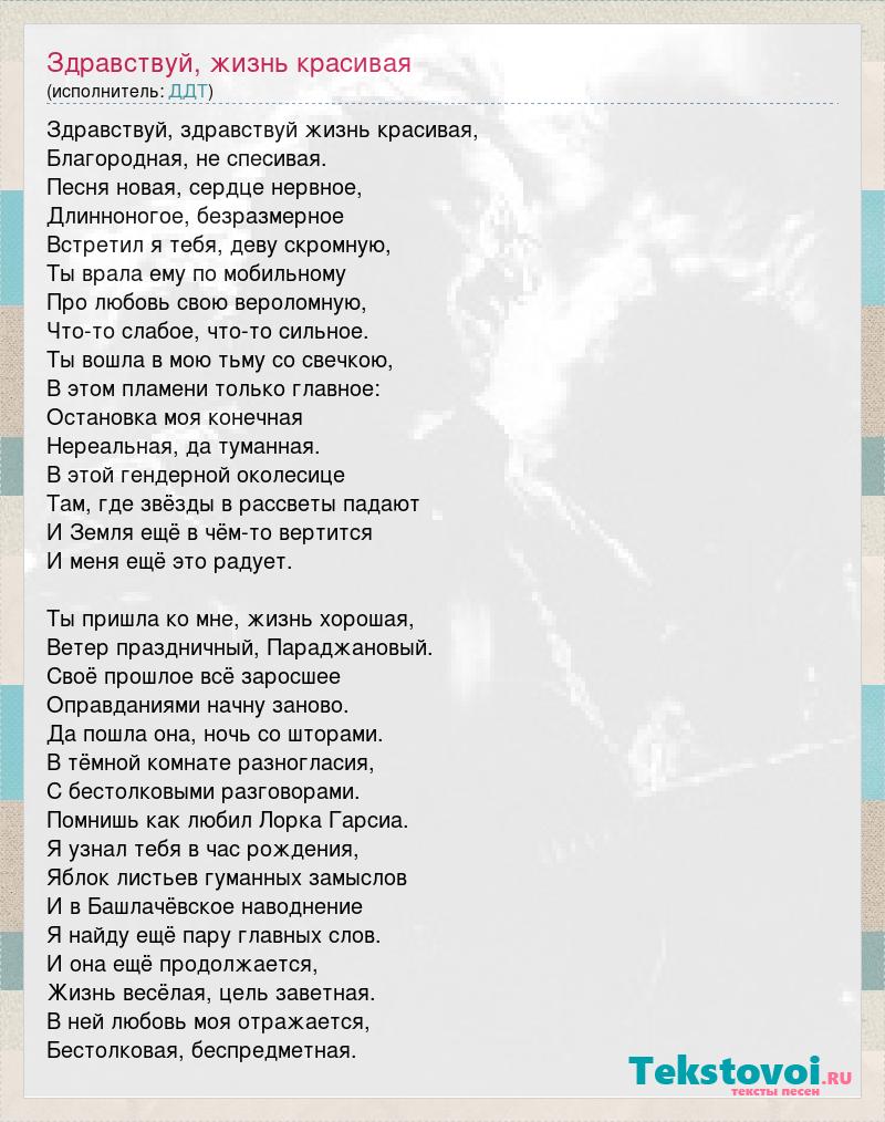 Здравствуй, здравствуй жизнь красивая, Благородная, не спесивая. Песня новая, сердце нервное, Длинноногое, безразмерное Встретил я тебя, деву скромную, Ты врала ему по мобильному Про любовь свою вероломную, Что-то слабое, что-то сильное. Ты вошла в мою тьму со свечкою, В этом пламени только главное: Остановка моя конечная Нереальная, да туманная. В этой гендерной околесице Там, где звёзды в рассветы падают И Земля ещё в чём-то вертится И меня ещё это радует. Ты пришла ко мне, жизнь хорошая, Ветер праздничный, Параджановый. Своё прошлое всё заросшее Оправданиями начну заново. Да пошла она, ночь со шторами. В тёмной комнате разногласия, С бестолковыми разговорами. Помнишь как любил Лорка Гарсиа. Я узнал тебя в час рождения, Яблок листьев гуманных замыслов И в Башлачёвское наводнение Я найду ещё пару главных слов. И она ещё продолжается, Жизнь весёлая, цель заветная. В ней любовь моя отражается, Бестолковая, беспредметная.