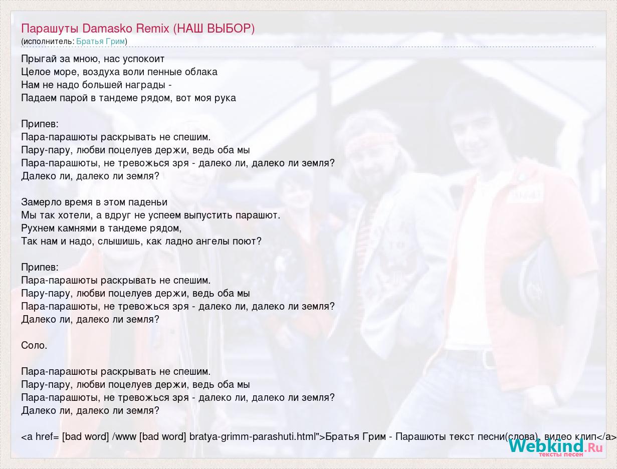 Прыгай за мною, нас успокоит Целое море, воздуха воли пенные облака Нам не надо большей награды - Падаем парой в тандеме рядом, вот моя рука Припев: Пара-парашюты раскрывать не спешим. Пару-пару, любви поцелуев держи, ведь оба мы Пара-парашюты, не тревожься зря - далеко ли, далеко ли земля? Далеко ли, далеко ли земля? Замерло время в этом паденьи Мы так хотели, а вдруг не успеем выпустить парашют. Рухнем камнями в тандеме рядом, Так нам и надо, слышишь, как ладно ангелы поют? Припев: Пара-парашюты раскрывать не спешим. Пару-пару, любви поцелуев держи, ведь оба мы Пара-парашюты, не тревожься зря - далеко ли, далеко ли земля? Далеко ли, далеко ли земля? Соло. Пара-парашюты раскрывать не спешим. Пару-пару, любви поцелуев держи, ведь оба мы Пара-парашюты, не тревожься зря - далеко ли, далеко ли земля? Далеко ли, далеко ли земля? <a href= [bad word] /www [bad word] bratya-grimm-parashuti.html">Братья Грим - Парашюты текст песни(слова), видео клип</a>