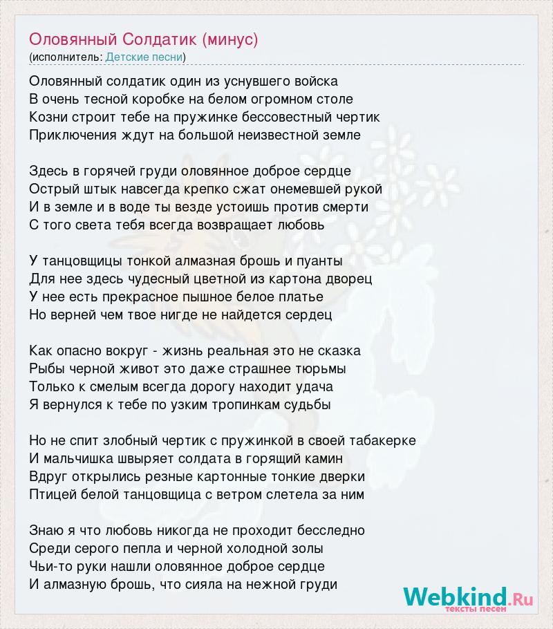 Оловянный солдатик один из уснувшего войска В очень тесной коробке на белом огромном столе Козни строит тебе на пружинке бессовестный чертик Приключения ждут на большой неизвестной земле Здесь в горячей груди оловянное доброе сердце Острый штык навсегда крепко сжат онемевшей рукой И в земле и в воде ты везде устоишь против смерти С того света тебя всегда возвращает любовь У танцовщицы тонкой алмазная брошь и пуанты Для нее здесь чудесный цветной из картона дворец У нее есть прекрасное пышное белое платье Но верней чем твое нигде не найдется сердец Как опасно вокруг - жизнь реальная это не сказка Рыбы черной живот это даже страшнее тюрьмы Только к смелым всегда дорогу находит удача Я вернулся к тебе по узким тропинкам судьбы Но не спит злобный чертик с пружинкой в своей табакерке И мальчишка швыряет солдата в горящий камин Вдруг открылись резные картонные тонкие дверки Птицей белой танцовщица с ветром слетела за ним Знаю я что любовь никогда не проходит бесследно Среди серого пепла и черной холодной золы Чьи-то руки нашли оловянное доброе сердце И алмазную брошь, что сияла на нежной груди