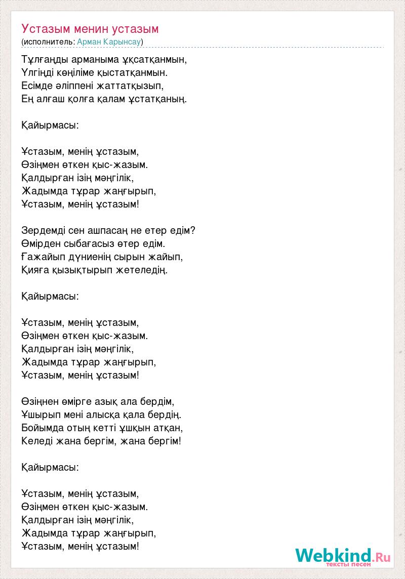 Тұлғаңды арманыма ұқсатқанмын, Үлгіңді көңіліме қыстатқанмын. Есімде әліппені жаттатқызып, Ең алғаш қолға қалам ұстатқаның. Қайырмасы: Ұстазым, менің ұстазым, Өзіңмен өткен қыс-жазым. Қалдырған ізің мәңгілік, Жадымда тұрар жаңғырып, Ұстазым, менің ұстазым! Зердемді сен ашпасаң не етер едім? Өмірден сыбағасыз өтер едім. Ғажайып дүниенің сырын жайып, Қияға қызықтырып жетеледің. Қайырмасы: Ұстазым, менің ұстазым, Өзіңмен өткен қыс-жазым. Қалдырған ізің мәңгілік, Жадымда тұрар жаңғырып, Ұстазым, менің ұстазым! Өзіңнен өмірге азық ала бердім, Ұшырып мені алысқа қала бердің. Бойымда отың кетті ұшқын атқан, Келеді жана бергім, жана бергім! Қайырмасы: Ұстазым, менің ұстазым, Өзіңмен өткен қыс-жазым. Қалдырған ізің мәңгілік, Жадымда тұрар жаңғырып, Ұстазым, менің ұстазым!