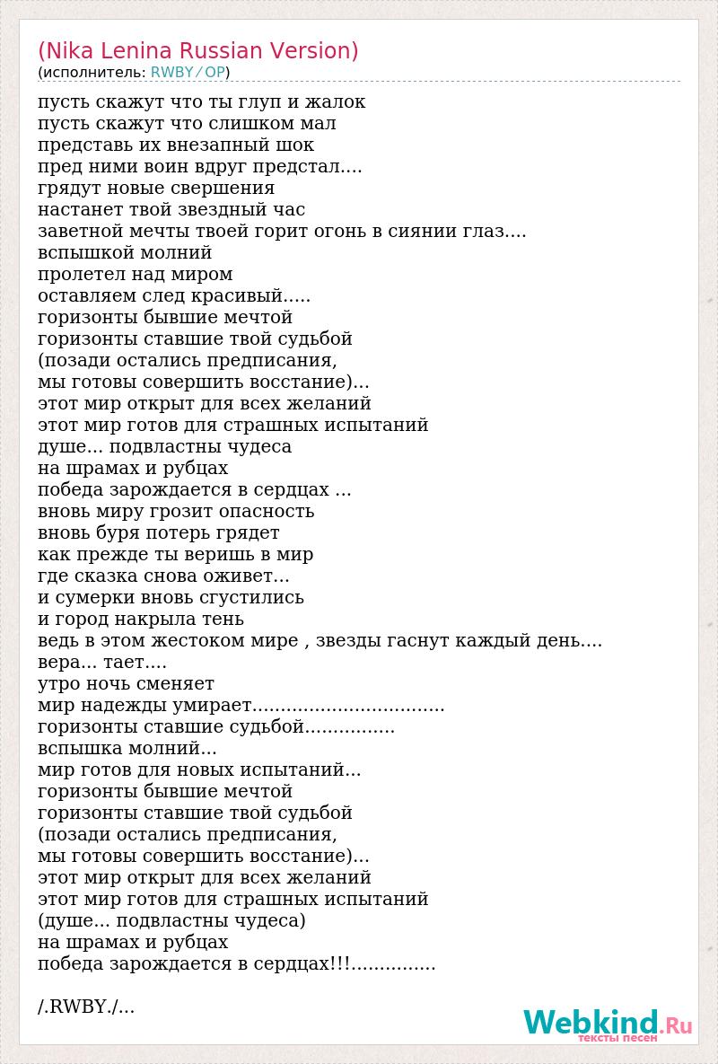 пусть скажут что ты глуп и жалок пусть скажут что слишком мал представь их внезапный шок пред ними воин вдруг предстал.... грядут новые свершения настанет твой звездный час заветной мечты твоей горит огонь в сиянии глаз.... вспышкой молний пролетел над миром оставляем след красивый..... горизонты бывшие мечтой горизонты ставшие твой судьбой (позади остались предписания, мы готовы совершить восстание)... этот мир открыт для всех желаний этот мир готов для страшных испытаний душе... подвластны чудеса на шрамах и рубцах победа зарождается в сердцах ... вновь миру грозит опасность вновь буря потерь грядет как прежде ты веришь в мир где сказка снова оживет... и сумерки вновь сгустились и город накрыла тень ведь в этом жестоком мире , звезды гаснут каждый день.... вера... тает.... утро ночь сменяет мир надежды умирает.................................. горизонты ставшие судьбой................ вспышка молний... мир готов для новых испытаний... горизонты бывшие мечтой горизонты ставшие твой судьбой (позади остались предписания, мы готовы совершить восстание)... этот мир открыт для всех желаний этот мир готов для страшных испытаний (душе... подвластны чудеса) на шрамах и рубцах победа зарождается в сердцах!!!............... /.RWBY./...