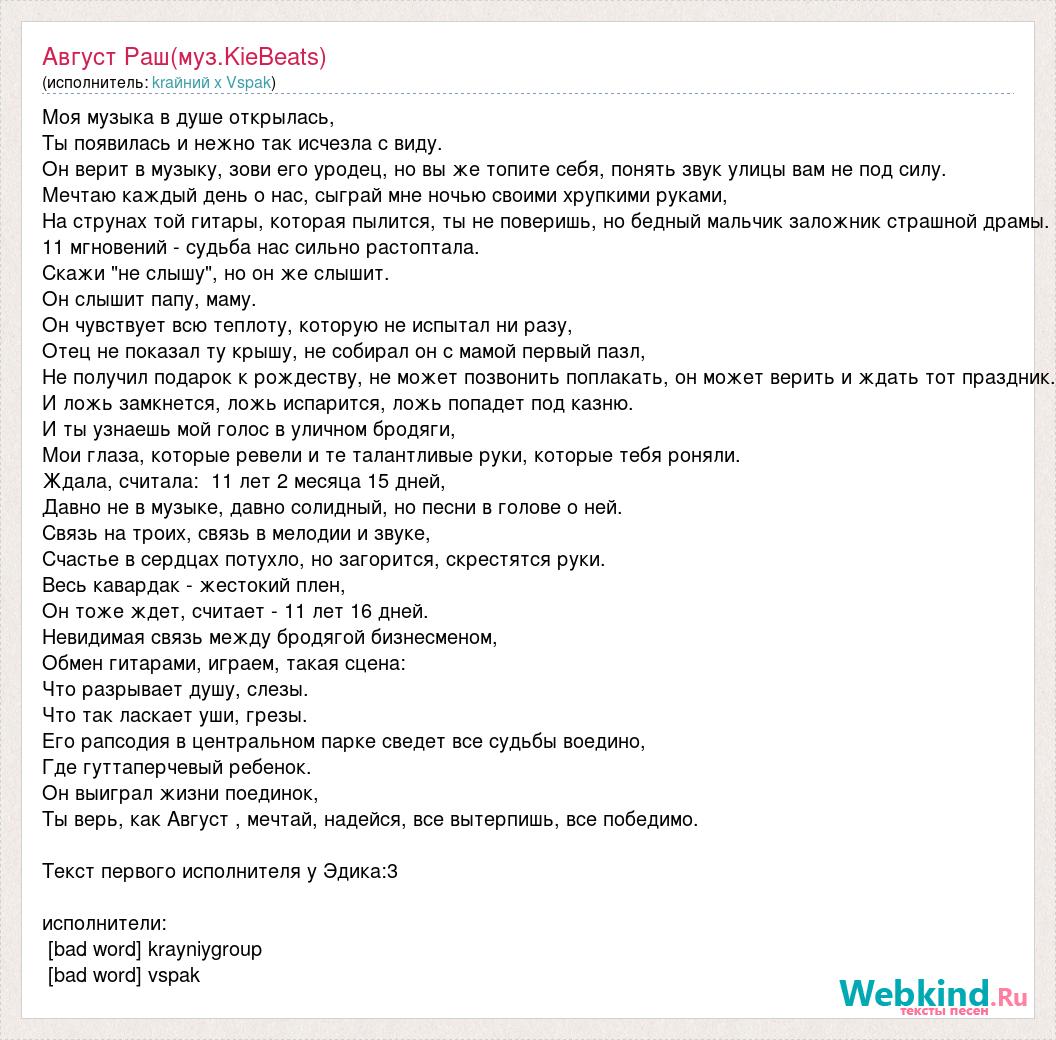 Моя музыка в душе открылась, Ты появилась и нежно так исчезла с виду. Он верит в музыку, зови его уродец, но вы же топите себя, понять звук улицы вам не под силу. Мечтаю каждый день о нас, сыграй мне ночью своими хрупкими руками, На струнах той гитары, которая пылится, ты не поверишь, но бедный мальчик заложник страшной драмы. 11 мгновений - судьба нас сильно растоптала. Скажи "не слышу", но он же слышит. Он слышит папу, маму. Он чувствует всю теплоту, которую не испытал ни разу, Отец не показал ту крышу, не собирал он с мамой первый пазл, Не получил подарок к рождеству, не может позвонить поплакать, он может верить и ждать тот праздник. И ложь замкнется, ложь испарится, ложь попадет под казню. И ты узнаешь мой голос в уличном бродяги, Мои глаза, которые ревели и те талантливые руки, которые тебя роняли. Ждала, считала: 11 лет 2 месяца 15 дней, Давно не в музыке, давно солидный, но песни в голове о ней. Связь на троих, связь в мелодии и звуке, Счастье в сердцах потухло, но загорится, скрестятся руки. Весь кавардак - жестокий плен, Он тоже ждет, считает - 11 лет 16 дней. Невидимая связь между бродягой бизнесменом, Обмен гитарами, играем, такая сцена: Что разрывает душу, слезы. Что так ласкает уши, грезы. Его рапсодия в центральном парке сведет все судьбы воедино, Где гуттаперчевый ребенок. Он выиграл жизни поединок, Ты верь, как Август , мечтай, надейся, все вытерпишь, все победимо. Текст первого исполнителя у Эдика:3 исполнители: [bad word] krayniygroup [bad word] vspak