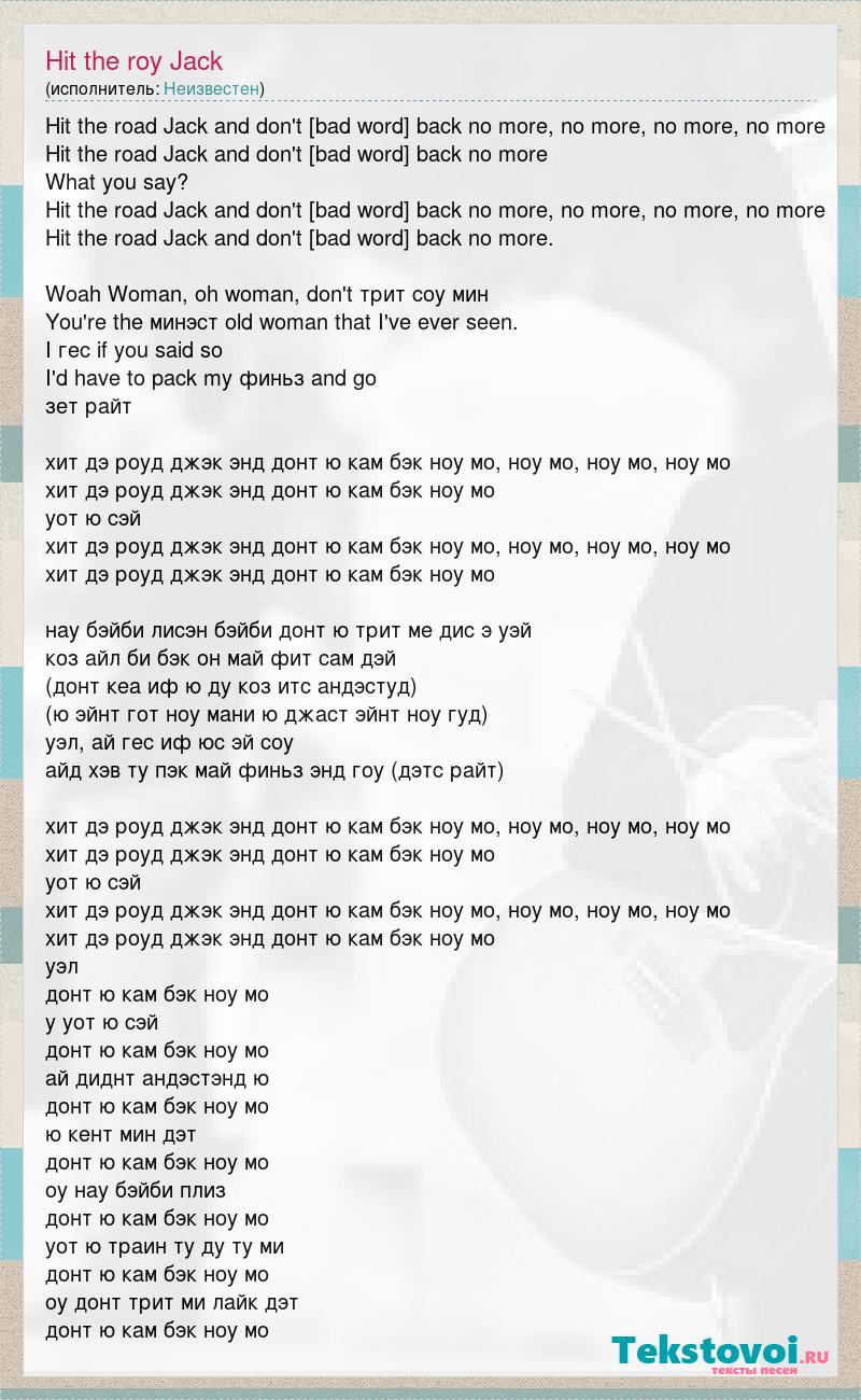 Hit the road Jack and don't [bad word] back no more, no more, no more, no more Hit the road Jack and don't [bad word] back no more What you say? Hit the road Jack and don't [bad word] back no more, no more, no more, no more Hit the road Jack and don't [bad word] back no more. Woah Woman, oh woman, don't трит соу мин You're the минэст old woman that I've ever seen. I гес if you said so I'd have to pack my финьз and go зет райт хит дэ роуд джэк энд донт ю кам бэк ноу мо, ноу мо, ноу мо, ноу мо хит дэ роуд джэк энд донт ю кам бэк ноу мо уот ю сэй хит дэ роуд джэк энд донт ю кам бэк ноу мо, ноу мо, ноу мо, ноу мо хит дэ роуд джэк энд донт ю кам бэк ноу мо нау бэйби лисэн бэйби донт ю трит ме дис э уэй коз айл би бэк он май фит сам дэй (донт кеа иф ю ду коз итс андэстуд) (ю эйнт гот ноу мани ю джаст эйнт ноу гуд) уэл, ай гес иф юс эй соу айд хэв ту пэк май финьз энд гоу (дэтс райт) хит дэ роуд джэк энд донт ю кам бэк ноу мо, ноу мо, ноу мо, ноу мо хит дэ роуд джэк энд донт ю кам бэк ноу мо уот ю сэй хит дэ роуд джэк энд донт ю кам бэк ноу мо, ноу мо, ноу мо, ноу мо хит дэ роуд джэк энд донт ю кам бэк ноу мо уэл донт ю кам бэк ноу мо у уот ю сэй донт ю кам бэк ноу мо ай диднт андэстэнд ю донт ю кам бэк ноу мо ю кент мин дэт донт ю кам бэк ноу мо оу нау бэйби плиз донт ю кам бэк ноу мо уот ю траин ту ду ту ми донт ю кам бэк ноу мо оу донт трит ми лайк дэт донт ю кам бэк ноу мо