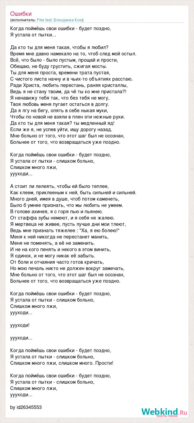 Когда поймёшь свои ошибки - будет поздно, Я устала от пытки... Да кто ты для меня такая, чтобы я любил? Время мне давно намекало на то, чтоб след мой остыл. Всё, что было - было пустым, прощай и прости, Обещаю, не буду грустить, сжигая мосты. Ты для меня проста, времени трата пустая, С чистого листа начну и в чьих-то объятиях расстаю. Ради Христа, любить перестань, раняя кристаллы, Ведь я не стану твоим, да чё ты ко мне пристала?! Я ненавижу тебя так, что без тебя не могу, Твоя любовь меня пугает остаться в долгу. Да я лгу на бегу, опять в себе ныкая муки, Чтобы по новой не взяли в плен эти нежные руки. Да кто ты для меня такая? ты медленный яд! Если же я, не успев уйти, ищу дорогу назад. Мне больно от того, что этот шаг был не осознан, Больнее от того, что возвращаться уже поздно. Когда поймёшь свои ошибки - будет поздно, Я устала от пытки - слишком больно, Слишком много лжи, уууходи... А стоит ли лелеять, чтобы ей было теплее, Как клеем, приклееным к ней, быть сильней и сильней. Много дней, имея в душе, чтоб потом каменеть, Было б умнее признать, что мы любить не умеем. В голове ахинея, я с горя пью и пьянею. От стаффа зубы немеют, и я себя не жалею. Я мертвеца не живее, пусть лучше дни мои тлеют, Ведь мне признать тяжелее : "Ха, я ею болею!" Меня к ней никогда не перестанет манить, Меня не поменять, а её не заменить. И не на кого пенять и некого в этом винить, Я одинок, и не могу никак её забыть. От боли и отчаяния часто готов кричать, Но мою печаль никто не должен вокруг замечать, Мне больно от того, что этот шаг был не осознан, Больнее от того, что возвращаться уже поздно. Когда поймёшь свои ошибки - будет поздно, Я устала от пытки - слишком больно, Слишком много лжи, уууходи... уууходи! уууходи... Когда поймёшь свои ошибки - будет поздно, Я устала от пытки - слишком больно, Слишком много лжи, слишком много. Прости! Когда поймёшь свои ошибки - будет поздно, Я устала от пытки - слишком больно, Слишком много лжи, уууходи... by id26345553