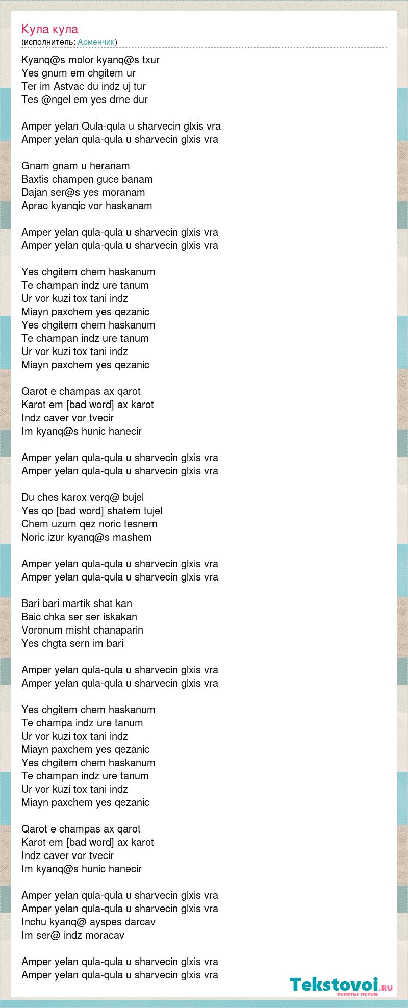 Kyanq@s molor kyanq@s txur Yes gnum em chgitem ur Ter im Astvac du indz uj tur Tes @ngel em yes drne dur Amper yelan Qula-qula u sharvecin glxis vra Amper yelan qula-qula u sharvecin glxis vra Gnam gnam u heranam Baxtis champen guce banam Dajan ser@s yes moranam Aprac kyanqic vor haskanam Amper yelan qula-qula u sharvecin glxis vra Amper yelan qula-qula u sharvecin glxis vra Yes chgitem chem haskanum Te champan indz ure tanum Ur vor kuzi tox tani indz Miayn paxchem yes qezanic Yes chgitem chem haskanum Te champan indz ure tanum Ur vor kuzi tox tani indz Miayn paxchem yes qezanic Qarot e champas ax qarot Karot em sirut ax karot Indz caver vor tvecir Im kyanq@s hunic hanecir Amper yelan qula-qula u sharvecin glxis vra Amper yelan qula-qula u sharvecin glxis vra Du ches karox verq@ bujel Yes qo siruc shatem tujel Chem uzum qez noric tesnem Noric izur kyanq@s mashem Amper yelan qula-qula u sharvecin glxis vra Amper yelan qula-qula u sharvecin glxis vra Bari bari martik shat kan Baic chka ser ser iskakan Voronum misht chanaparin Yes chgta sern im bari Amper yelan qula-qula u sharvecin glxis vra Amper yelan qula-qula u sharvecin glxis vra Yes chgitem chem haskanum Te champa indz ure tanum Ur vor kuzi tox tani indz Miayn paxchem yes qezanic Yes chgitem chem haskanum Te champan indz ure tanum Ur vor kuzi tox tani indz Miayn paxchem yes qezanic Qarot e champas ax qarot Karot em sirut ax karot Indz caver vor tvecir Im kyanq@s hunic hanecir Amper yelan qula-qula u sharvecin glxis vra Amper yelan qula-qula u sharvecin glxis vra Inchu kyanq@ ayspes darcav Im ser@ indz moracav Amper yelan qula-qula u sharvecin glxis vra Amper yelan qula-qula u sharvecin glxis vra