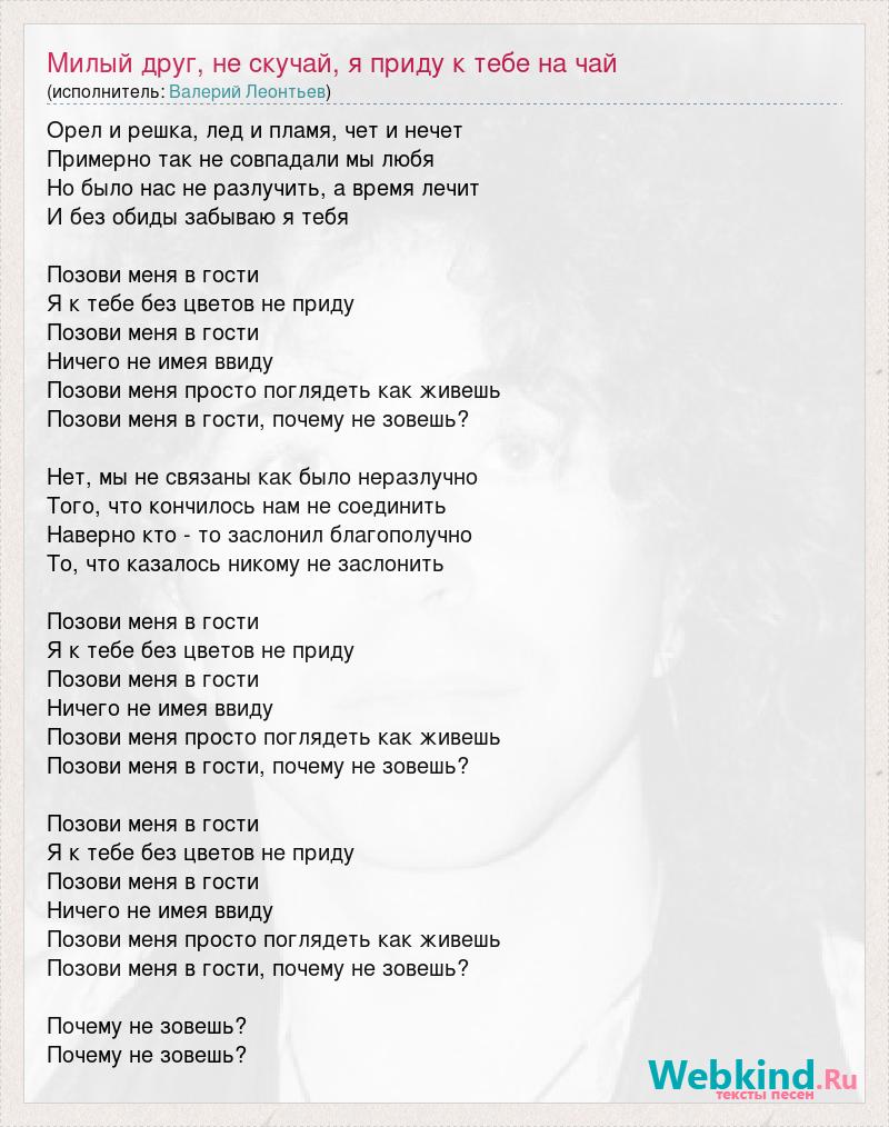 Орел и решка, лед и пламя, чет и нечет Примерно так не совпадали мы любя Но было нас не разлучить, а время лечит И без обиды забываю я тебя Позови меня в гости Я к тебе без цветов не приду Позови меня в гости Ничего не имея ввиду Позови меня просто поглядеть как живешь Позови меня в гости, почему не зовешь? Нет, мы не связаны как было неразлучно Того, что кончилось нам не соединить Наверно кто - то заслонил благополучно То, что казалось никому не заслонить Позови меня в гости Я к тебе без цветов не приду Позови меня в гости Ничего не имея ввиду Позови меня просто поглядеть как живешь Позови меня в гости, почему не зовешь? Позови меня в гости Я к тебе без цветов не приду Позови меня в гости Ничего не имея ввиду Позови меня просто поглядеть как живешь Позови меня в гости, почему не зовешь? Почему не зовешь? Почему не зовешь?