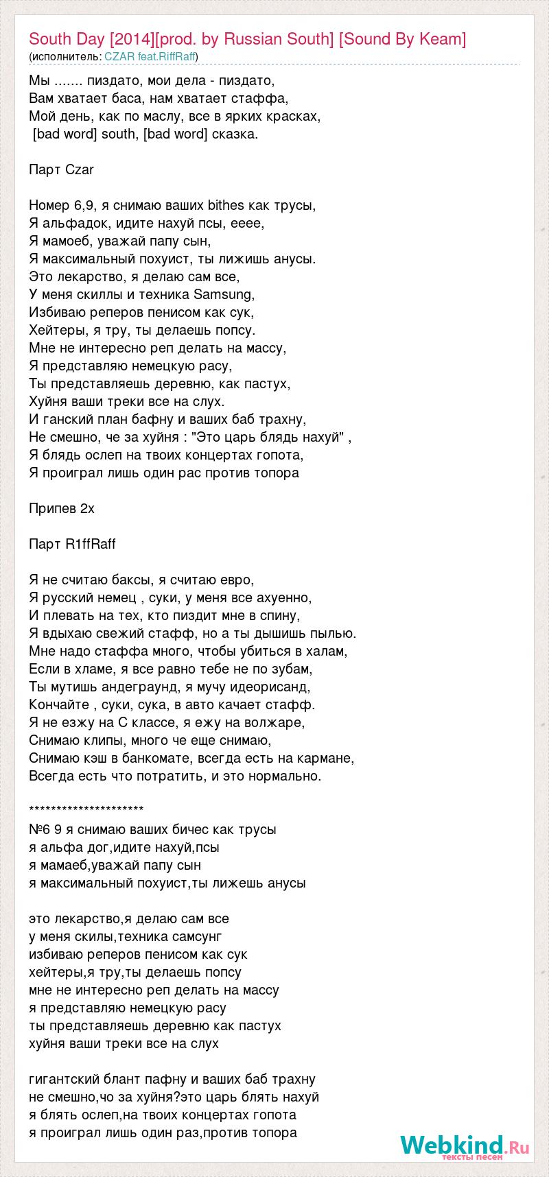 Мы ....... пиздато, мои дела - пиздато, Вам хватает баса, нам хватает стаффа, Мой день, как по маслу, все в ярких красках, [bad word] south, [bad word] сказка. Парт Czar Номер 6,9, я снимаю ваших bithes как трусы, Я альфадок, идите нахуй псы, ееее, Я мамоеб, уважай папу сын, Я максимальный похуист, ты лижишь анусы. Это лекарство, я делаю сам все, У меня скиллы и техника Samsung, Избиваю реперов пенисом как сук, Хейтеры, я тру, ты делаешь попсу. Мне не интересно реп делать на массу, Я представляю немецкую расу, Ты представляешь деревню, как пастух, Хуйня ваши треки все на слух. И ганский план бафну и ваших баб трахну, Не смешно, че за хуйня : "Это царь блядь нахуй" , Я блядь ослеп на твоих концертах гопота, Я проиграл лишь один рас против топора Припев 2х Парт R1ffRaff Я не считаю баксы, я считаю евро, Я русский немец , суки, у меня все ахуенно, И плевать на тех, кто пиздит мне в спину, Я вдыхаю свежий стафф, но а ты дышишь пылью. Мне надо стаффа много, чтобы убиться в халам, Если в хламе, я все равно тебе не по зубам, Ты мутишь андеграунд, я мучу идеорисанд, Кончайте , суки, сука, в авто качает стафф. Я не езжу на С классе, я ежу на волжаре, Снимаю клипы, много че еще снимаю, Снимаю кэш в банкомате, всегда есть на кармане, Всегда есть что потратить, и это нормально. ********************* №6 9 я снимаю ваших бичес как трусы я альфа дог,идите нахуй,псы я мамаеб,уважай папу сын я максимальный похуист,ты лижешь анусы это лекарство,я делаю сам все у меня скилы,техника самсунг избиваю реперов пенисом как сук хейтеры,я тру,ты делаешь попсу мне не интересно реп делать на массу я представляю немецкую расу ты представляешь деревню как пастух хуйня ваши треки все на слух гигантский блант пафну и ваших баб трахну не смешно,чо за хуйня?это царь блять нахуй я блять ослеп,на твоих концертах гопота я проиграл лишь один раз,против топора
