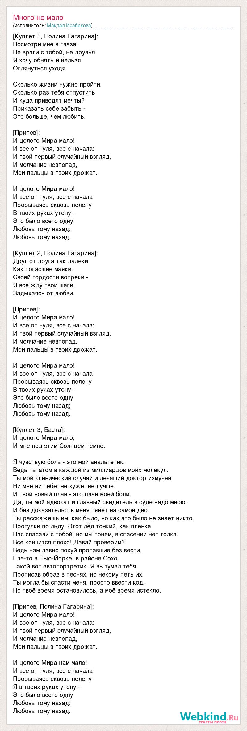 [Куплет 1, Полина Гагарина]: Посмотри мне в глаза. Не враги с тобой, не друзья. Я хочу обнять и нельзя Оглянуться уходя. Сколько жизни нужно пройти, Сколько раз тебя отпустить И куда приводят мечты? Приказать себе забыть - Это больше, чем любить. [Припев]: И целого Мира мало! И все от нуля, все с начала: И твой первый случайный взгляд, И молчание невпопад, Мои пальцы в твоих дрожат. И целого Мира мало! И все от нуля, все с начала Прорываясь сквозь пелену В твоих руках утону - Это было всего одну Любовь тому назад; Любовь тому назад. [Куплет 2, Полина Гагарина]: Друг от друга так далеки, Как погасшие маяки. Своей гордости вопреки - Я все жду твои шаги, Задыхаясь от любви. [Припев]: И целого Мира мало! И все от нуля, все с начала: И твой первый случайный взгляд, И молчание невпопад, Мои пальцы в твоих дрожат. И целого Мира мало! И все от нуля, все с начала Прорываясь сквозь пелену В твоих руках утону - Это было всего одну Любовь тому назад; Любовь тому назад. [Куплет 3, Баста]: И целого Мира мало, И мне под этим Солнцем темно. Я чувствую боль - это мой анальгетик. Ведь ты атом в каждой из миллиардов моих молекул. Ты мой клинический случай и лечащий доктор измучен Ни мне ни тебе; не хуже, не лучше. И твой новый план - это план моей боли. Да, ты мой адвокат и главный свидетель в суде надо мною. И без доказательств меня тянет на самое дно. Ты расскажешь им, как было, но как это было не знает никто. Прогулки по льду. Этот лёд тонкий, как плёнка. Нас спасали с тобой, но мы тонем, в спасении нет толка. Всё кончится плохо! Давай проверим? Ведь нам давно похуй пропавшие без вести, Где-то в Нью-Йорке, в районе Сохо. Такой вот автопортретик. Я выдумал тебя, Прописав образ в песнях, но некому петь их. Ты могла бы спасти меня, просто ввести код, Но твоё время остановилось, а моё время истекло. [Припев, Полина Гагарина]: И целого Мира мало! И все от нуля, все с начала: И твой первый случайный взгляд, И молчание невпопад, Мои пальцы в твоих дрожат. И целого Мира нам мало! И все от нуля, все с начала Прорываясь сквозь пелену Я в твоих руках утону - Это было всего одну Любовь тому назад; Любовь тому назад.